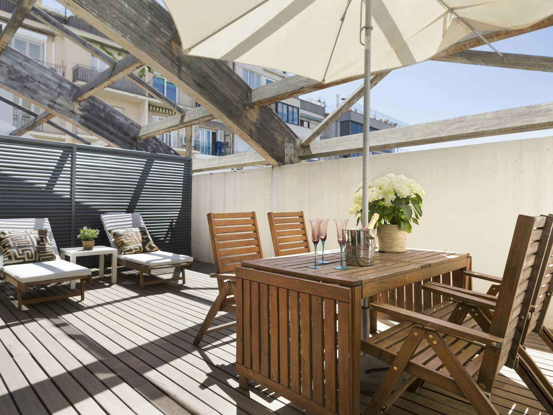 Welcome to the Penthouse with Private Terrace in Sarrià for 6! This penthouse in Sarrià is approximately 80 m2 and has a 30 m2 private terrace, where you can enjoy moments outdoors in complete privacy. Located in a building with an elevator, you also have the option of having Private Parking for €30/day for greater comfort. In addition, you will be well connected with public transport, since the Muntaner metro station is nearby. The Penthouse with Private Terrace in Sarrià for 6 - Mensuelles Locations has the capacity to accommodate up to 4 people comfortably, with 2 single beds and a double bed distributed in 2 rooms. In addition, the apartment has 1 bathroom with a bathtub and 1 additional toilet. In the living room you will find a sofa bed that provides additional space to accommodate more guests if necessary. The kitchen is fully equipped with a dishwasher, microwave, coffee maker, electric cooker, electric kettle, oven, fridge and ceramic hob, so you can easily prepare your meals. You will also find an iron, hairdryer, TV, air conditioning, heating, washer and dryer in the apartment for added comfort during your stay. In addition, we offer free Wi-Fi so you can stay connected during your visit to (hidden). It is important to mention that the Penthouse with Private Terrace in Sarrià for 6 - Locations mensuelles is just one of the many apartments that we can offer you in the same building. The photos you have seen are a selection of different apartments in the building. Although the apartments may differ slightly in color or furnishings, we guarantee that the apartment you have rented will be assigned to you upon arrival. We hope you enjoy an unforgettable stay in the Penthouse with Private Terrace in Sarrià for 6 and that you can explore all that this fascinating city has to offer....