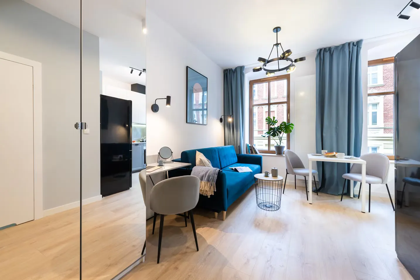 STUDIO FLAT FOR RENT Settle in a classy studio apartment overlooking the city, located on the first floor of a renovated building. The fully equipped kitchenette has been cleverly arranged in a recess that gives the feeling of independent zones. A modern bathroom has been equipped with a comfortable walk-in shower. Two large windows with a beautiful city view let the daylight in. At the entrance you'll be welcomed by a spacious wardrobe with a mirror surface, additionally reflecting the light. A soft velvet sofa, curtains in grey-blue color, black lamps, and accessories give the interior an outstanding elegance. Amenities: Full equipement Refrigerator Induction cooktop Washing machine Dishwasher Oven Electric kettle Pots, pans, plates & utensils, Ironing and cleaning accessories Extra storage space Intercom Neighborhood The apartment is located in a beautiful building downtown, a few minutes walk from the main train station and just a few steps from the tram stop. In the immediate vicinity, you will find grocery stores, cafés, and restaurants, as well as stores of local brands. Two large shopping centers are within walking distance. The nearby Miarki Square invites you to relax in the shade of the trees and buy seasonal products at the charming local market. Kościuszki Park, the city's largest park, is also within walking distance. What can you expect when renting with Wellcome Home? Fast & reliable WiFi Tenant care and emergencies Flexible rental terms Transparent price No side agreements with other providers Utilities tracker Pet-friendly Additional services on demand (cleaning, transfer, move-in service etc). Transparent price with no surprises Rental fee: 2000 PLN Administration charges: 210 PLN Security deposit: 2510 PLN Utilities advanced payment: 300 PLN Commission: 0 PLN always Flexible rental Don't get stuck with your fixed all year rental agreement. Choose a flexible agreement and renounce if your plans change. Get in touch with us to get more details. Well? Come home...