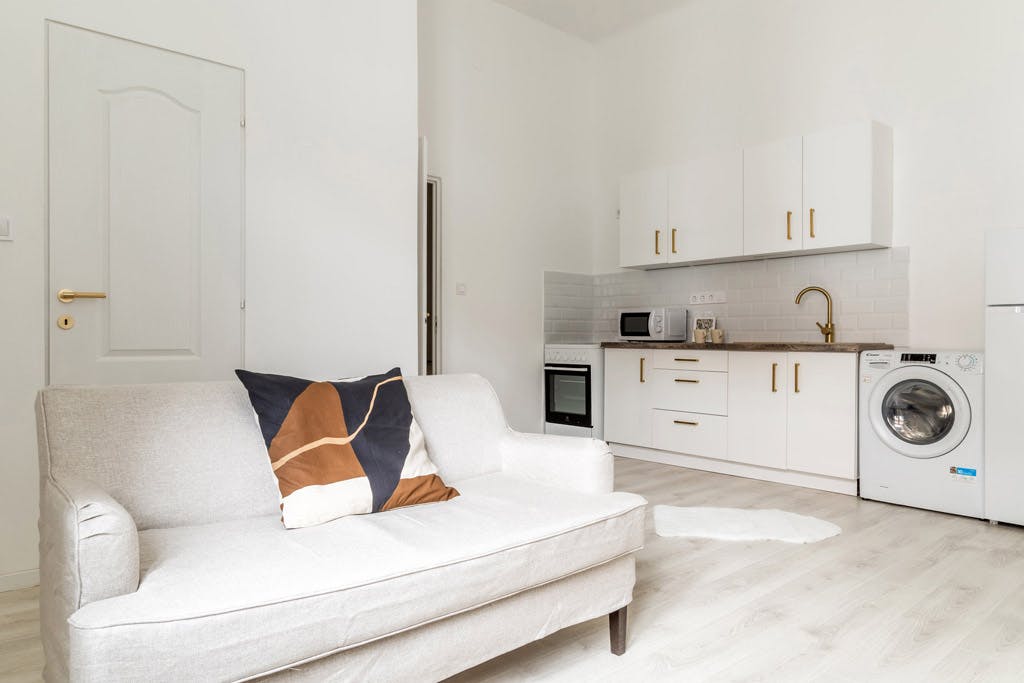 ✨"A" STUDIO FLAT ✨ ✔RENT: 610 EUR + fixed costs/month -EXTRA COSTS: fixed 100 EUR/month with utility bills, internet, common costs, cleaning service The cleaning lady comes twice a month to clean the whole flat and to change your sheets. ✔BEDROOM: double bed, desk, bedside tables, wardrobe, sheets, towels, chair ✔KITCHEN: wall unit, sink, dinner-set, glasses, mugs, cutlery, tableware, fridge, stove, oven, microwave, dinner table, chairs, washer-dryer ✔LIVING ROOM: smart TV, couch, TV stand ✔BATHROOM: shower, sink, toilet Please acknowledge that we handle multiply parallel inquiries per room. We handle each request individually. If the room is not free, we offer another room. We show everything at the check-in. We sign the original copy of the rental contract and take over the (amount of 2 months rental fee) deposit. We rent out to students and only make contracts for the following periods: ✔Period 1: from January/or February to June/or July (6 months minimum) ✔Period 2: August to January (6 months) ✔Period 3: August to July (12 months) We manage all the utility payments, cleaning, maintenance, and necessary repairs. Before you leave, we agree on a check out date. We take the keys and give back your deposit. Please be aware that HousingAnywhere is an online booking platform. Therefore exchanging contact details and offering viewings is not possible. If you would like to reserve this accommodation, send me a booking request or a message and please mention your age and occupation. I look forward to meeting you...