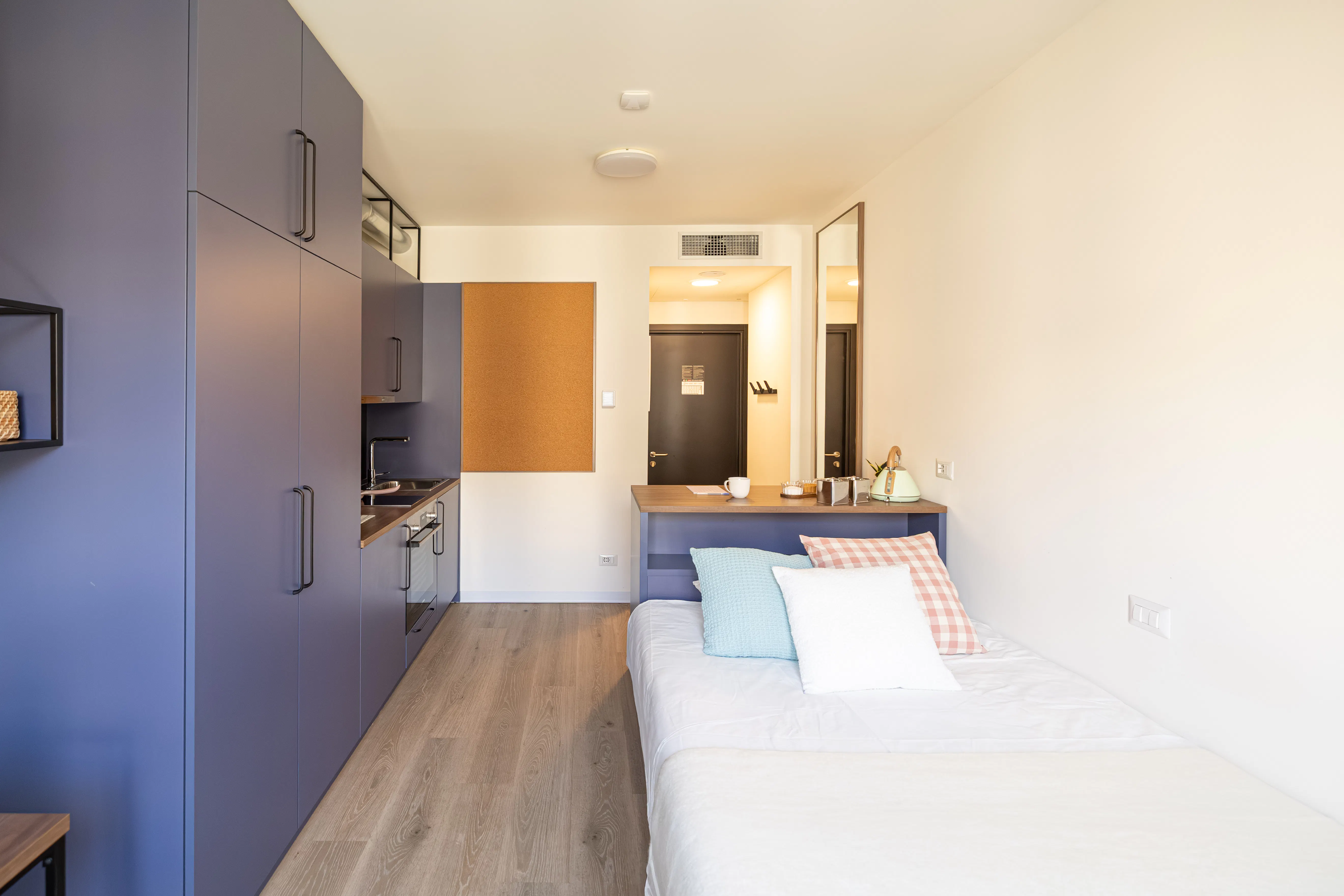 Smart Studio is an apartment unit of approximately 19 square metres in total, with a private bathroom and kitchen. Features: - The ideal solution for your study years - Floor: 0°-3° What will you find in the room? - 120x200 cm bed - Desk with study lamp and swivel chair with upholstered seat - Wardrobe with storage space in the upper part - Dining table with two stools - Fully equipped kitchen with sink, induction hob, electric and microwave oven, refrigerator and crockery cupboards/utensils - Independent heating or cooling adjustable by thermostat - Large bathroom (approx. 4sqm) with shower - Access with electronic KeyCard or smartphone app What will you need to bring? - Bed linen, bathroom accessories and towels - Kitchen accessories (pots and pans for induction hob, cutlery, utensils, plates, chopping boards, dishcloths, etc.) What is included in the price? - Utilities: Electricity, Water, Internet (WiFi + broadband wired) - 24/7 Security - Routine maintenance - Access to indoor gym - Weekly room cleaning Common areas: - gaming area, cinema and music studio - Yoga room, study rooms and reading lounge - Indoor laundry room equipped with Miele Professional 8kg machines: washing (€ 2.50) and drying (€ 2.00)...