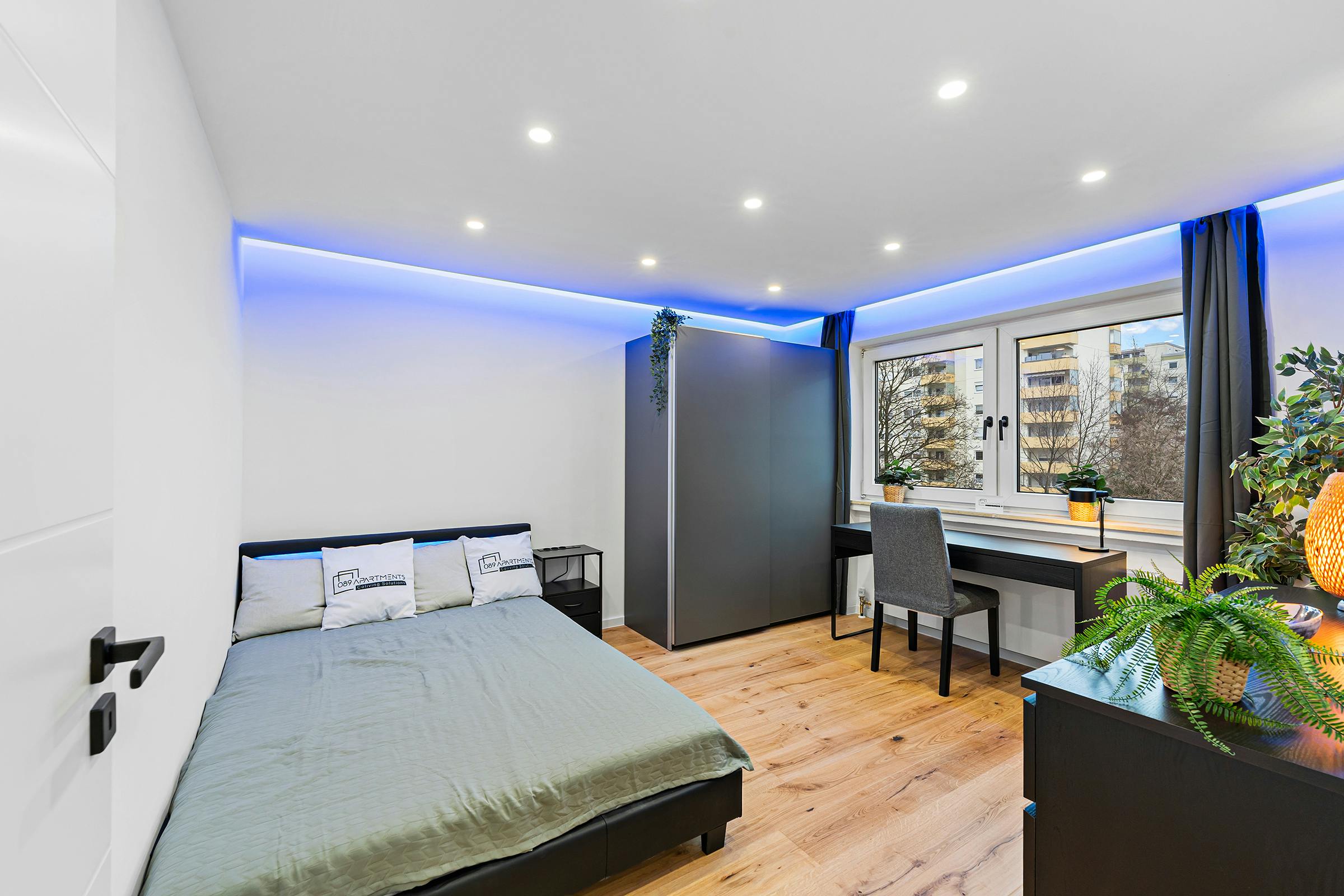 The newly and high-quality equipped room (Room 3 - on the floor plan) is part of a 81 sqm newly renovated apartment in Munich, Aubing. The next S-Bahn station (Westkreuz) is just a 5-minute walk away. The generous hallway gives a very inviting impression and provides access to all rooms of the large apartment. The apartment also has a newly furnished bathroom, with a washbasin and LED mirror, a towel radiator and a shower as well as a toilet. Get a 360-view of how the apartment looks like: https://my.matterport.com/show/?m=gb9q4qZmvDJ The comfortably furnished room has the following brand-new furniture: - 140 cm Bed - Large wardrobe - Desk with drawers and upholstered chair - Chest of drawers - Decorative wall picture The table and floor lamps, plants, TV and office supplies shown in the pictures are for illustration purposes only and are not included with the rental. The pictures are reference pictures, because the apartment is not finished yet. The kitchen offers all imaginable conveniences: - All kitchen equipment such as plates, glasses, cookware, etc. - Kettle and toaster - Dishwasher - Microwave - Induction hob, oven and extractor hood - Refrigerator The apartment is equipped with everything you need and is perfectly prepared for you to move in and feel at home immediately. Of course, you also have unlimited access to the superfast Wi-Fi with 100 Mbit/s. The rent already includes all costs for using your room and all common areas (no hidden costs!)...
