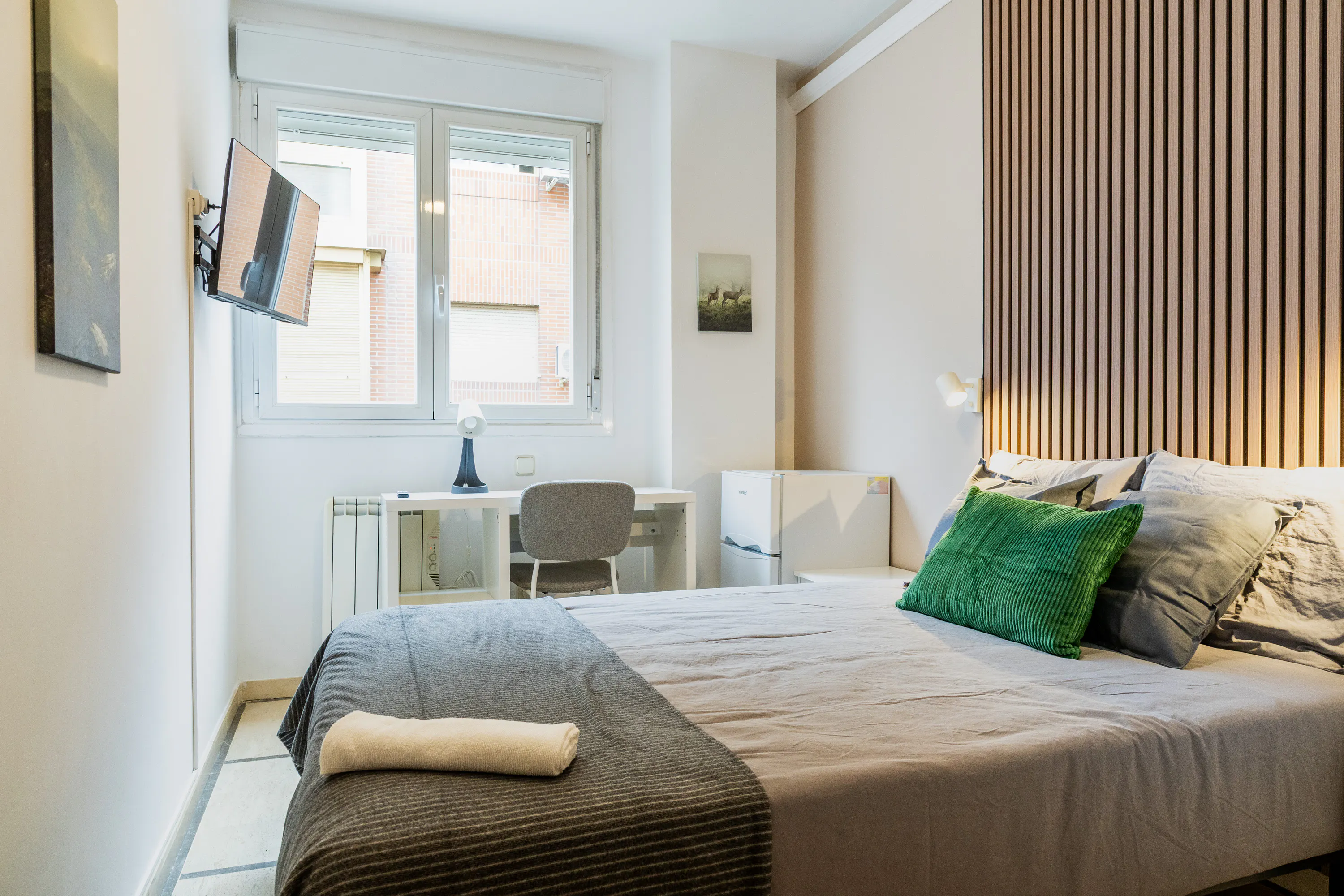 Perfect for those looking for a modern, functional, and well-connected living space. Apartment features: 4 spacious and bright bedrooms, each equipped with a personal fridge. 1 full bathroom with good ventilation. Large shared terrace, ideal for relaxing or spending time outdoors. Fully equipped kitchen with appliances. Simple, modern decoration. Cleaning of common areas included. Expenses: 50€ per person. Location: Located in a quiet and well-connected area, just a few minutes from Nueva Numancia metro station, with easy access to Atocha and Madrid city center. Nearby you’ll find supermarkets, bars, gyms, and green areas. Rental requirements: 1 month of rent. 1 month deposit. Service fee: 1 month (only for the first month). Deposit & fees: The security deposit and administrative fees must be paid by bank transfer. Bank details will be provided upon booking confirmation. A comfortable, well-connected apartment ready to move in. Contact us for more information or to book your room...