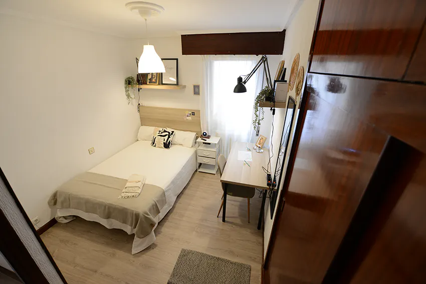 ZONA SOLOKOETXE HABITACIÓN H4 INDIVIDUAL Habitación n poco más pequeña pero también luminosa. Suelo y ventanas de PVC. Calefacción y agua caliente central. Portero y recogida de basuras. Zona de estudio con mesa escritorio, estantería, silla y flexos. Equipada con un gran armario empotrado, cama doble de 1,35x1,90m. con cabecero y mesilla con luz led. Proyector 4k wifi para tener el cine en tu habitación. Ropa de cama: Protector de colchón, almohadas, plaid y cojines incluidos. Relleno nórdico, funda de relleno nórdico, toallas y sábanas no incluidas, se pueden comprar a la llegada. Alquilamos por meses naturales completos. Los gastos de suministros y limpieza de zonas comunes están incluidos en el precio. Por favor lee bien todos los detalles de los costes. CARACTERÍSTICAS – 110m2 | 5 habitaciones. – 2 habitaciones de uso individual o para pareja. – 3 habitación de uso individual. – Actualizado, baños y cocina reformados. ZONAS COMUNES – Cocina totalmente equipada con zona de comedor y zona de tendedero y plancha. – 2 baños completos con ducha . DESCRIPCIÓN DEL PISO Piso recién actualizado, cocina y 5 habitaciones amplias. Cocina-con zona de tendedero y electrodomésticos nuevos (combi americano, lavadora, secadora, horno, vitrocerámica y microondas). Baños con duchas y mamparas. Suelo de madera, calefacción central y recogida de basuras. Es un piso cómodo y muy bien equipado con habitaciones amplias y armarios empotrados. Está situado en el No3 del Grupo Reverendo Vicente Garamendi (Grupo Garamendi),un grupo de viviendas altas, en una zona residencial con zonas verdes y muy bien comunicada. Muy cerca del Mercado de la Rivera y de la Plaza Unamuno. Entre Santutxu y Casco Viejo, en la zona de Solokoetxe. Se accede al Casco Viejo por varias calles. Los que buscan cercanía a zonas comerciales y turísticas tienen el Casco Viejo y Santutxu al pie de casa. El metro queda a 5 minutos (Plaza Unamuno o Santutxu salida Zabalbide) y se puede coger el Bus que te lleva a la Universidad de Leioa en el Ayuntamiento o en Santutxu. Hay varios trenes EUSKOTREN de cercanías con paradas en Casco Viejo (Zazpi Kaleak), Atxuri o Abando y líneas de autobuses BILBOBUS (pinchando en este enlace podrás ver las líneas con paradas más cercanas) y BIZKAIBUS, además del tranvía EUSKOTRAN para llegar a todo Bilbao y a sus alrededores que para en el teatro Arriaga o en Atxuri. Hay un super en la misma calle y todos los servicios muy cercanos (bancos, farmacias, centro de salud, mercado ...) en el Casco Viejo y Santutxu...