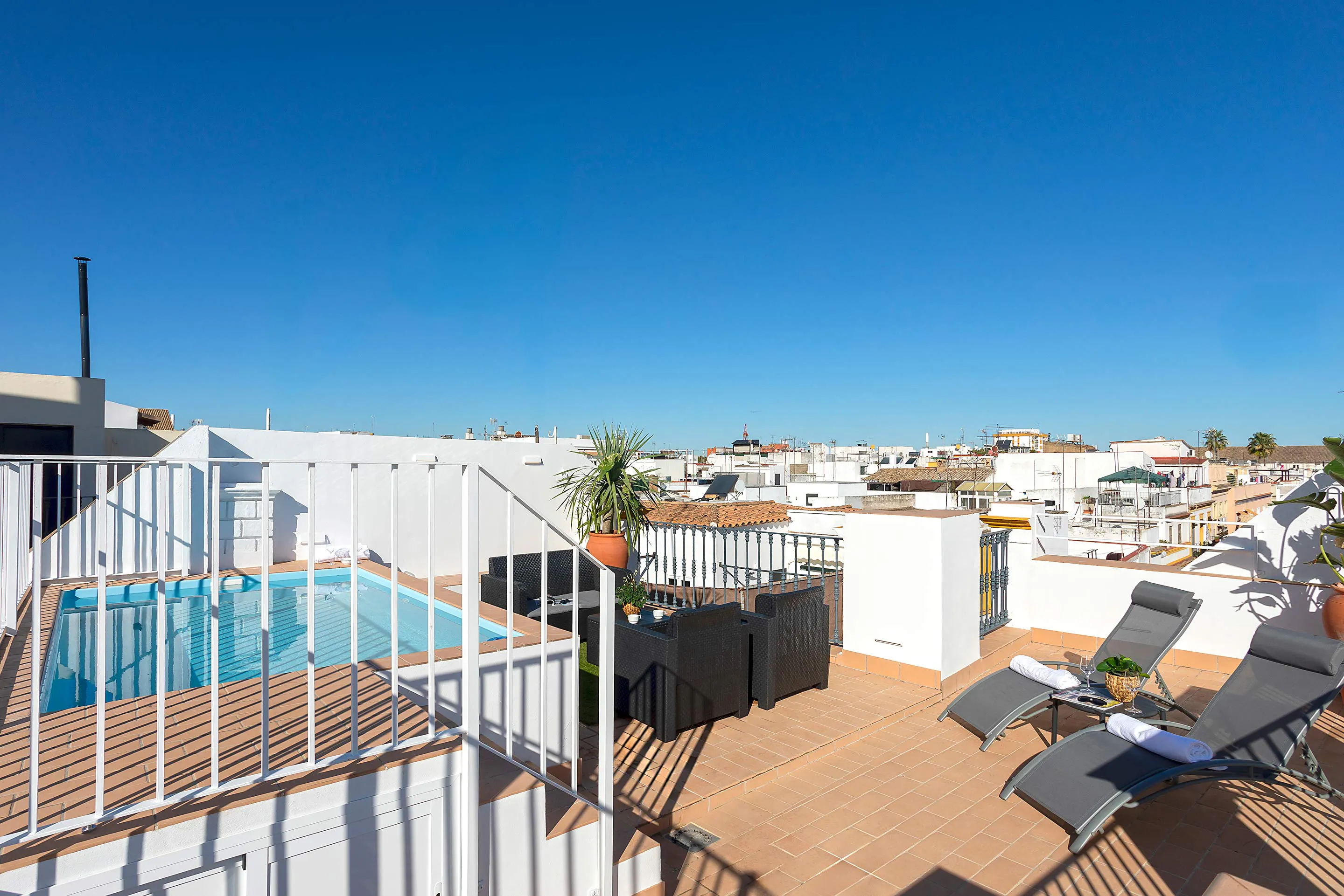 Upon entering the apartment, you are welcomed by a spacious and bright open-plan area that seamlessly combines the living room and the kitchen, creating a modern and inviting atmosphere. The kitchen is fully equipped, and the living area features a Smart TV, sofa, armchair, and dining table, making it an ideal space for both relaxation and dining. A charming balcony also provides plenty of natural light and pleasant views of the surroundings. To the right of the living area is the master bedroom, designed as a cozy and private retreat. It features a comfortable double bed, Smart TV, an en-suite bathroom, and a private balcony, perfect for enjoying moments of peace and quiet. Before entering the apartment, on the right-hand side, an independent door leads to a spectacular private terrace. After ascending an elegant spiral staircase, you will discover an exclusive outdoor space equipped with a private pool, sun loungers, and outdoor furniture, designed for relaxation, sunbathing, and enjoying Seville’s wonderful climate in a unique and privileged setting. Its location is unbeatable: within a few minutes on foot, you can visit the city’s main landmarks, such as the Fine Arts Museum and the Cathedral. Additionally, the historic San Vicente neighborhood offers an excellent selection of tapas bars and restaurants. The booking of each (hidden) accommodation includes the offer of extra experiences or activities to improve your experience, which are managed by external providers, who will inform you by e-mail or (hidden), and you can contract or refuse them. For more information about the management of experiences and extra activities of the accommodations, please visit our Privacy Policy on our official website. ** For monthly stays, water and electricity supplies will be included up to a maximum of € 100 per month. If the expenses are higher, the guest will have to pay the difference. The corresponding invoice will be sent by the accommodation to the guest to verify the expenses** During your stay, the access to the property is limited exclusively to the number of individuals specified at the booking process. Consequently, entry to the property is strictly prohibited for persons not registered as guests. Failure to adhere to this rule will result in an additional charge amounting to 50% of the total cost of the stay as a penalty, or alternatively, immediate expulsion from the accommodation...