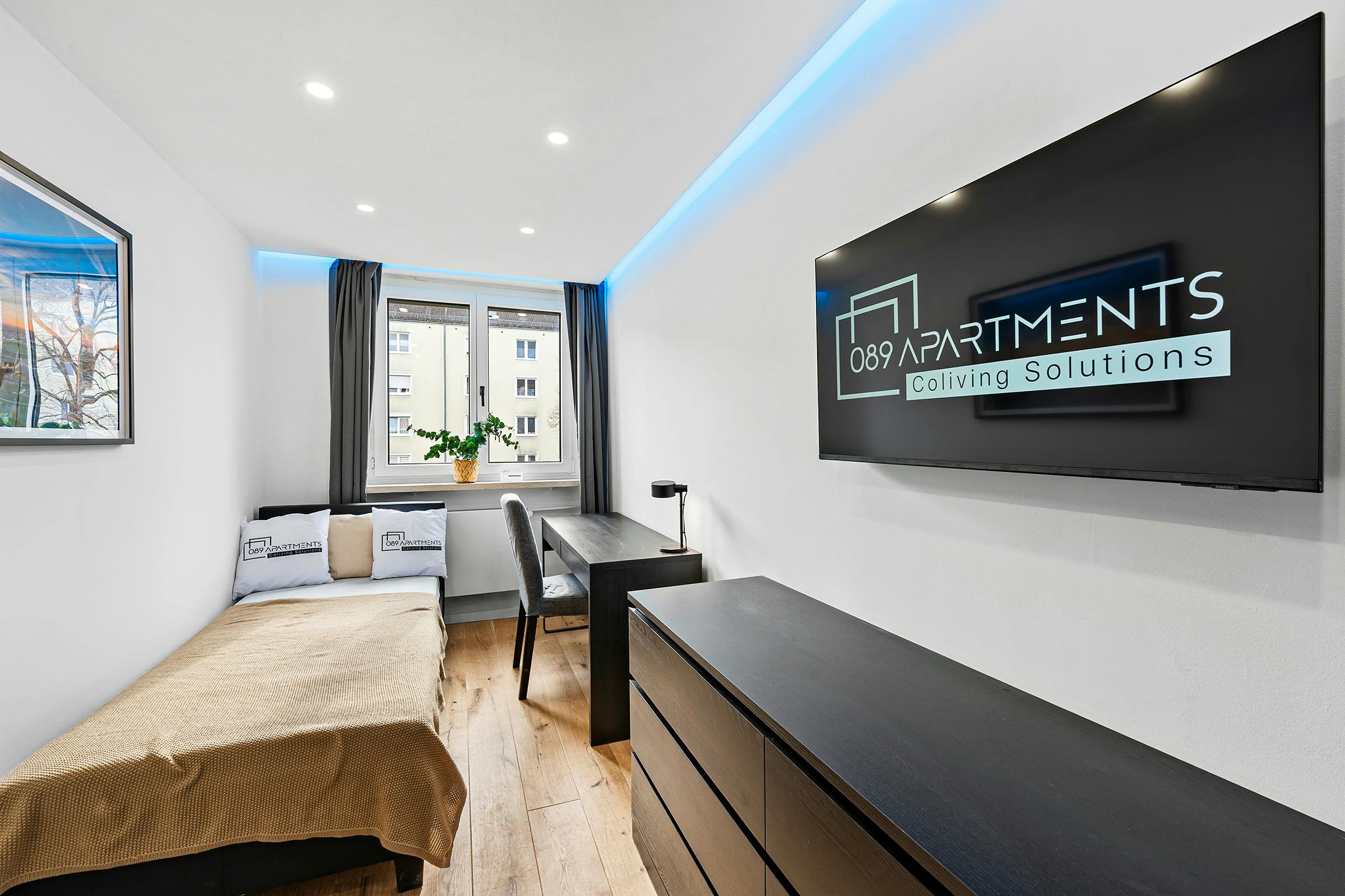 The newly and high-quality equipped room (Room 2) is part of an 75 sqm freshly renovated apartment in Munich-Feldmoching-Hasenbergl. The Hasenbergl U-Bahn station (U2) and several bus lines are just a 5-minute walk away, providing fast and direct access to Munich city center. The generous hallway gives a very inviting impression and provides access to all rooms of the large apartment. The apartment also has a newly furnished bathroom with a washbasin and LED mirror, a towel radiator, a shower, a washing machine, a dryer and a toilet. The comfortably furnished room has the following brand-new furniture: - Bed with mattress - Private TV (Samsung 43'') - Large wardrobe with drawers - Desk with drawers and upholstered chair - Sideboard The kitchen offers all imaginable conveniences: - All kitchen equipment such as plates, glasses, cookware, etc. - Kettle and toaster - Dishwasher - Microwave - Induction hob, oven, and extractor hood - Refrigerator 360 Matterport View: https://my.matterport.com/show/?m=rLMrhpMAWiH The apartment is equipped with everything you need and is perfectly prepared for you to move in and feel at home immediately. Of course, you also have unlimited access to the super-fast WiFi with 100 Mbit/s. The rent already includes all utility costs for your room and all common areas (no hidden costs!). The deposit has to be paid latest by the move-in date, otherwise, no move-in and key handover is possible...