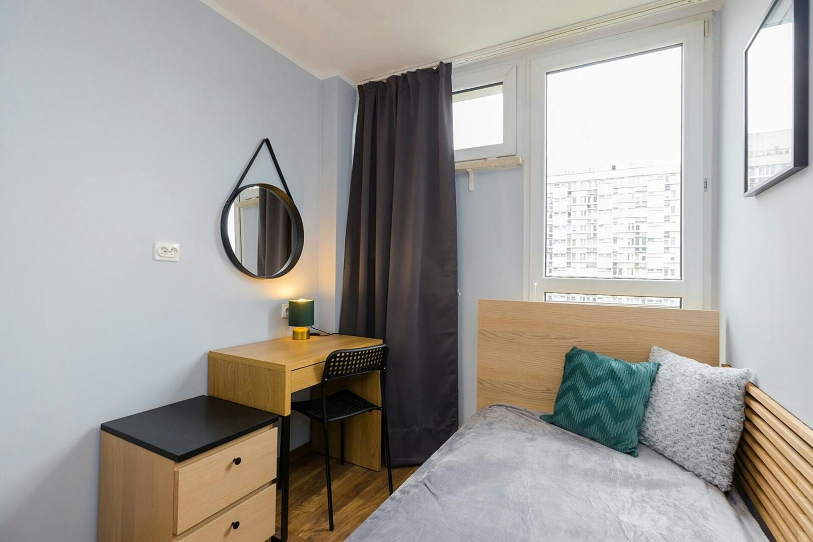 Room for 1 person in the Wola district A single room in the Wola district, with an area of 9 m2. The room is equipped with all the essentials to ensure a comfortable and pleasant stay. The apartment with rooms is located on the 9th floor, and there is an elevator. Space — ROOM: Single bed, bedding, desk with chair, table, TV cabinet, television, and wardrobe. — SHARED KITCHEN: Induction hob, kettle, oven, dishwasher, microwave, refrigerator, glasses, a set of pots, cutlery, and a frying pan. — SHARED BATHROOM: Shower, toilet, sink, mirror, hairdryer, towels. — OTHER: Iron with ironing board, washing machine, and drying rack available in the common area. — MULTIMEDIA: TV, Wi-Fi internet. — PETS: Pets are not allowed. — PARKING: Paid public parking. Guest access NEARBY: Rondo ONZ Metro Station Central Railway Station Złote Tarasy Shopping Center Warsaw Uprising Museu...