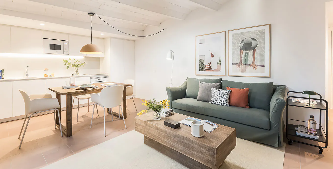 Promos by length of stay in the final price: -Booking + 4 months: 5% discount -Booking + 9 months: 7,5% discount -Booking + 12 months: 10% discount Please contact us to apply for the discount in your booking request! - Utilities included in the price up to 120€ - 180€ depending of the apartment. - Some apartments pets are allow by request. There is an extra charge for pets. Please contact us to know the supplement and availability! -- In the heart of Barcelona and overlooking a beautifully landscaped inner courtyard, this 58 m2 exterior apartment is located on the fifth floor of a newly built development within Oasis Barcelona —Living operated by (hidden). Designed for mid-term stays, it offers a contemporary lifestyle that blends thoughtful design, comfort, and access to premium amenities such as a TechnoGym-equipped fitness center, landscaped gardens, communal terraces, a coworking space, and a rooftop solarium — all in a quiet, well-maintained environment. The interior is defined by its efficient layout and calm, elegant atmosphere. The living-dining area features a deep green sofa with clean lines and a natural wood coffee table, flowing seamlessly into an open-plan kitchen with matte white cabinetry, integrated appliances, and hidden storage solutions. Overhead, exposed white-painted beams add a sense of continuity and openness, while warm lighting and organic materials create a serene foundation. Carefully chosen textiles, wood finishes, and subtle décor elements introduce texture and character. The bedroom is spacious and bright, furnished with a double bed and Mediterranean-inspired side tables, while the modern bathroom features soft ceramic finishes and a clean, functional design. Set in the Gòtic quarter, just steps from charming squares, cafés, and independent shops, the apartment offers a perfect balance between the vibrant energy of the city and the comfort of a well-connected residential retreat...