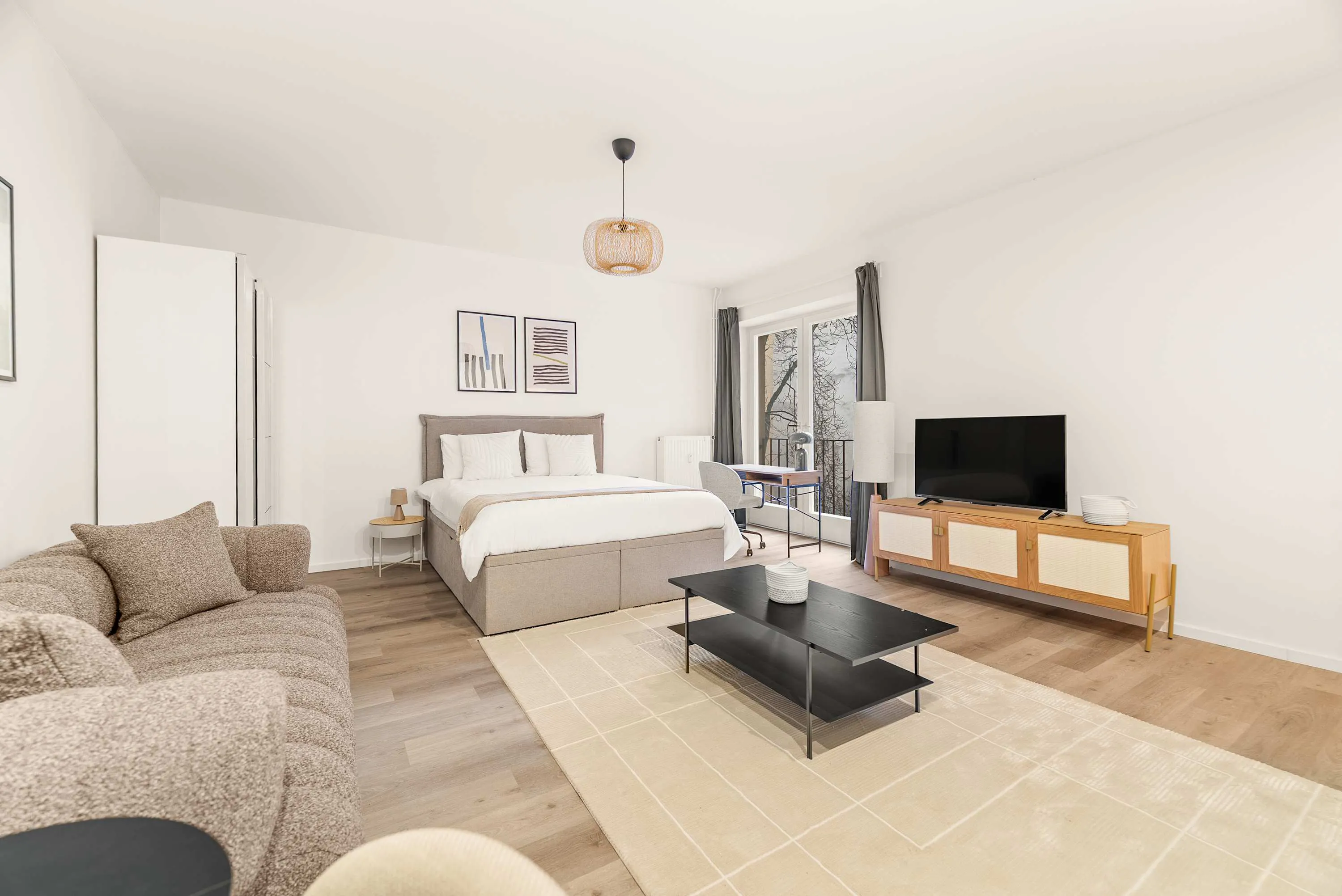 This stunning furnished studio apartment features contemporary design, a fully equipped kitchen, and a cozy living area with breathtaking views. Perfectly situated, you'll have easy access to everything that makes Berlin vibrant and exciting! Welcome to Charlottenburg, where historic grandeur meets modern sophistication. Situated in the western part of Berlin, this neighborhood boasts elegant streets lined with stately buildings, upscale boutiques, and cultural landmarks such as Charlottenburg Palace. Experience the charm of leafy boulevards, tranquil parks like Tiergarten, and a vibrant arts scene. Charlottenburg offers a perfect blend of refined living and cosmopolitan flair...