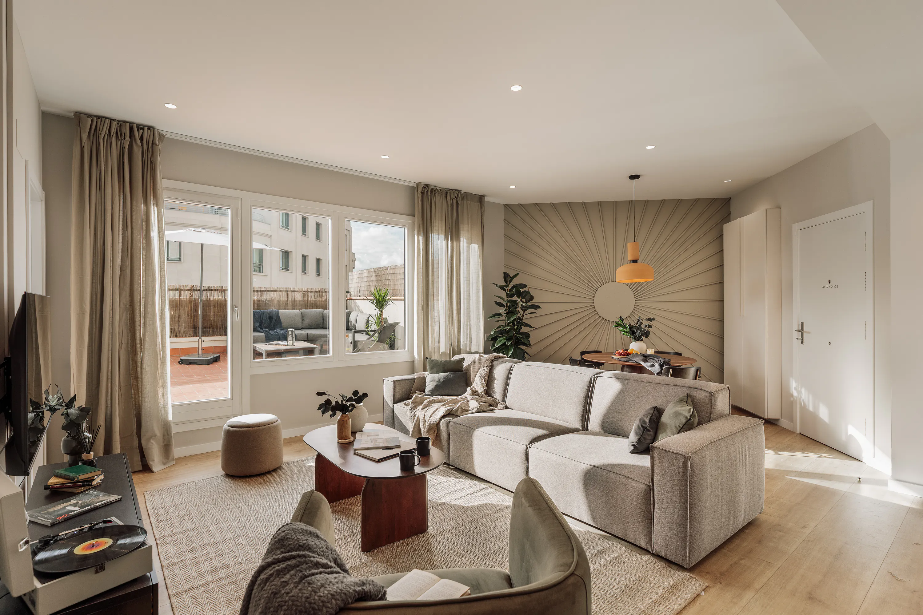 Spectacular apartment in Gran Via street, with 2 bedrooms and 2 bathrooms. The kitchen is equipped with appliances and kitchenware. The beds are equipped with soft bedding, ideal for a good night's rest. The apartment has 2 bathrooms equipped with a full shower and towels. The apartment has a terrace of 55 m2. In addition, the apartment is equipped with high-speed WiFi and SmartTV. The apartment has a washing machine, dishwasher and air conditioning for your maximum comfort. *This apartment comes equipped with a ducted air system in all rooms for absolute comfort. *Please, note that this apartment does not allow pets. Fees are subject to apply. Guests will be informed of any additional charges in the final contract. *We cannot be held liable for any noises (construction, or street noise) done outside the apartment. We also cannot be liable for any rooms without air conditioning (all the rooms with air conditioner will be explicitly explained in our description). We will not accept any reservation cancellations or refund requests related to these two issues. *This accommodation may only be used for stays longer than 31 nights for personal purposes such as holiday, recreational, or leisure. (hidden) may request documentation proving your permanent residence and the reason for your stay in Catalonia, and may cancel the reservation if it does not meet the legal requirements. The information provided may be submitted to the relevant registry and/or administrative authority in accordance with Catalan regulations. *Our in-house design team expertly selects all apartment furniture and decor to ensure the highest level of quality and comfort. As part of consistent home upkeep, design improvements, and photo staging, there may be minor differences in furnishings seen in the photos and what you find in the apartment. Inquire with a sales agent for any questions or doubts...