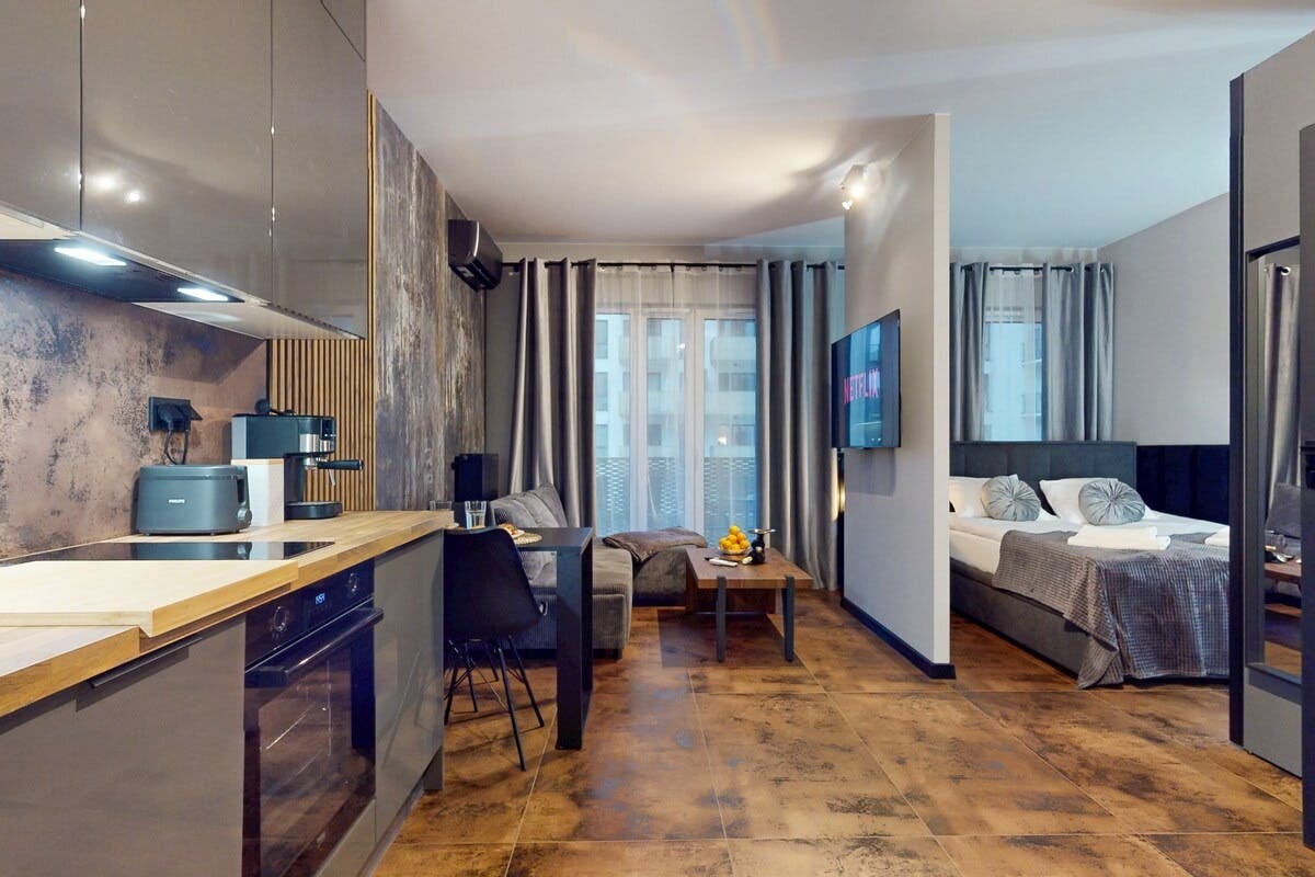 💢💢💢 🏢 A fully equipped studio apartment with a private balcony, air conditioning and a dedicated parking space in an underground garage, located in a new and elegant residential complex in Warsaw’s Wola district. The area offers an excellent balance between urban convenience and green surroundings, with parks and public transport nearby. Thanks to well-connected bus and tram lines, the city centre can be reached in about 20 minutes, making this apartment ideal for those who value comfort and quick access. 🛏️ The living and sleeping area is designed for both relaxation and functionality, featuring a comfortable double bed, a sofa bed and a Smart TV, making the space suitable for individuals, couples or guests. The kitchenette is fully equipped and includes a hob, oven, dishwasher, toaster and coffee maker, allowing for easy everyday cooking and longer stays. The bathroom is modern and practical, fitted with a shower and a washing machine for added convenience. 📍 Location highlights: The nearest grocery store, Żabka, is approximately 200 metres away (2–3 minutes on foot). Fort Wola shopping centre can be reached in about 20 minutes on foot, while numerous restaurants, cafés and service points are available along Wolska, Jana Kazimierza and Górczewska streets. Green spaces such as Powstańców Warszawy Park (12 minutes on foot), Edward Szymański Park (18 minutes) and Moczydło Park (25 minutes) are all within easy walking distance. Śródmieście (city centre) is around 15–20 minutes away, Rondo Daszyńskiego business district is reachable in 10–15 minutes, and Warszawa Zachodnia (West Railway Station) is also just 10–15 minutes away. 🚋 Transport connections: The ‘Redutowa’ bus stop is approximately 200 metres away (2 minutes on foot), while the ‘Reduta Wolska’ tram stop is about 300 metres away (3–5 minutes on foot). The M2 metro line – ‘Księcia Janusza’ station is located around 1.5 km away, reachable in approximately 20 minutes on foot. 💢💢�...