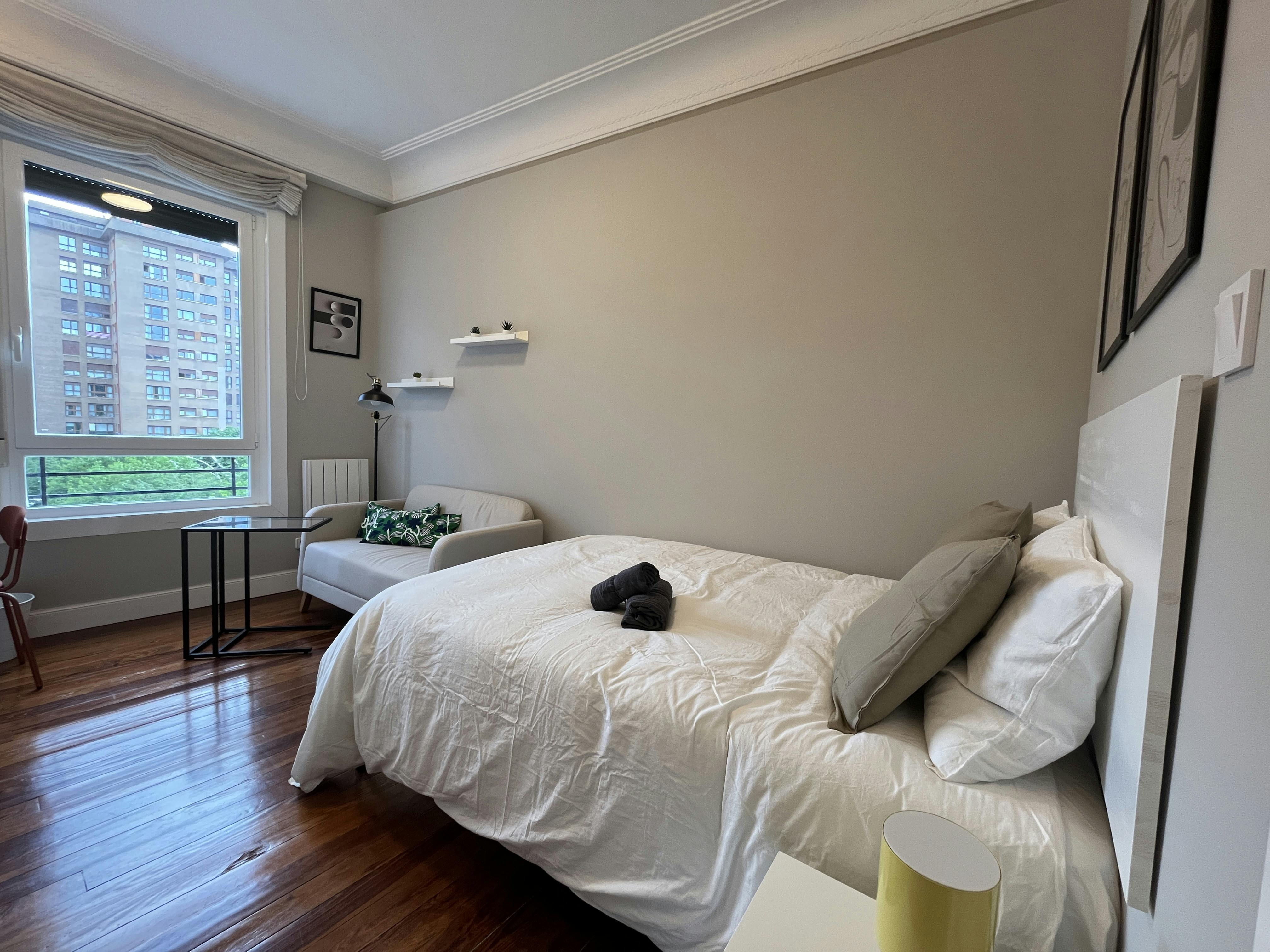 Esta habitación se encuentra en un magnífico piso situado en el corazón de Bilbao, frente a la plaza Indautxu. El piso cuenta con un total de 6 habitaciones y 3 baños (uno de ellos en suite) completos, y un ambiente muy tranquilo de gente joven y trabajadora. Cercanía a metro, estación de autobuses, supermercados y todo tipo de servicios. Características de la habitación: - Muy luminosa y exterior - Smart TV 32′′ y conexión a internet Fibra - Armario y cómoda de gran capacidad - Sofá y lámpara de noche - Escritorio, silla y flexo El precio incluye: - Gastos (agua, luz, gas y Wifi) - Juego de ropa de cama y de toallas - Servicio semanal de limpieza de zonas comunes - Servicio de mantenimiento y CAU 24/7...
