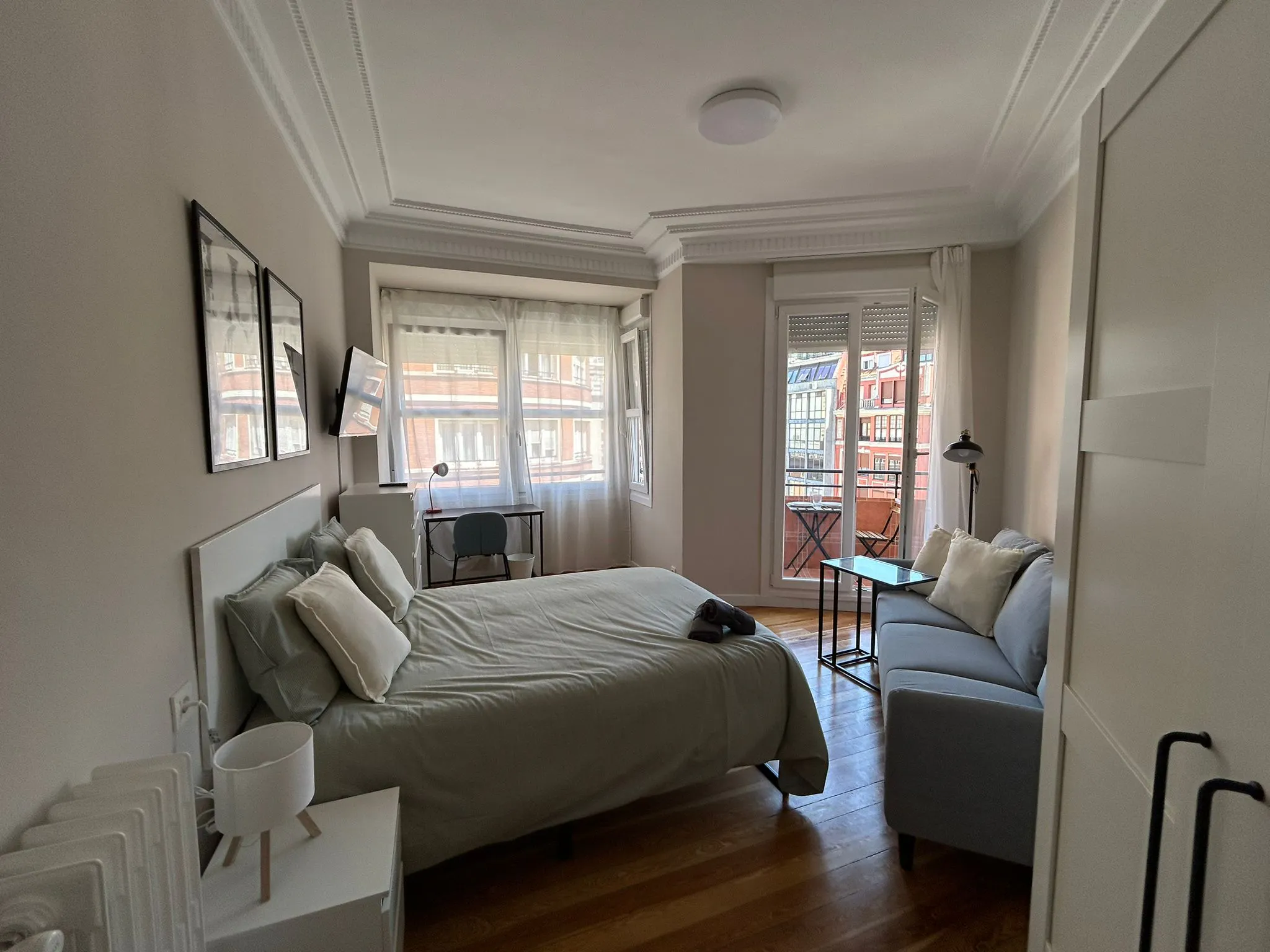 Habitación exterior con balcón en el centro de Bilbao. El ambiente en el piso es muy tranquilo dado que todos los inquilinos tienen rutinas ordenadas y tranquilas. La calidad de vida es muy buena y el ambiente muy respetuoso. Se alquila habitación en vivienda compartida. La habitación tiene un tamaño de 16m2 donde el huésped podrá vivir con todas las comodidades de estar ubicado en una de las zonas más céntricas de la ciudad de Bilbao. En cuanto a la vivienda, se trata de una vivienda de 150 m2 útiles distribuida en 6 habitaciones totalmente equipadas, 2 baños completos comunes y reformados así como una cocina totalmente equipada con electrodomésticos nuevos. El edificio cuenta con caldera individual de gas. El ambiente tanto de la casa como de la comunidad vecinal es muy tranquilo. La habitación es muy luminosa, cuenta con ventana con salida a balcón y está equipada con el siguiente mobiliario: Cama doble de 1,35m con mesilla de noche Smart TV de 32′′ Armario de gran almacenaje Cómoda Escritorio individual con silla y flexo Sofá 3 plazas Mesa y sillas de balcón Cerradura privada El alquiler incluye todos los gastos así como servicio semanal de limpieza de los espacios comunes de la vivienda (cocina, baños y zonas de paso). Piso reformado en pleno centro neurálgico de la ciudad, rodeada de todo tipo de servicios (bancos, centro de salud, supermercados y metro de Doctor Areilza a 3 minutos andando de la vivienda...