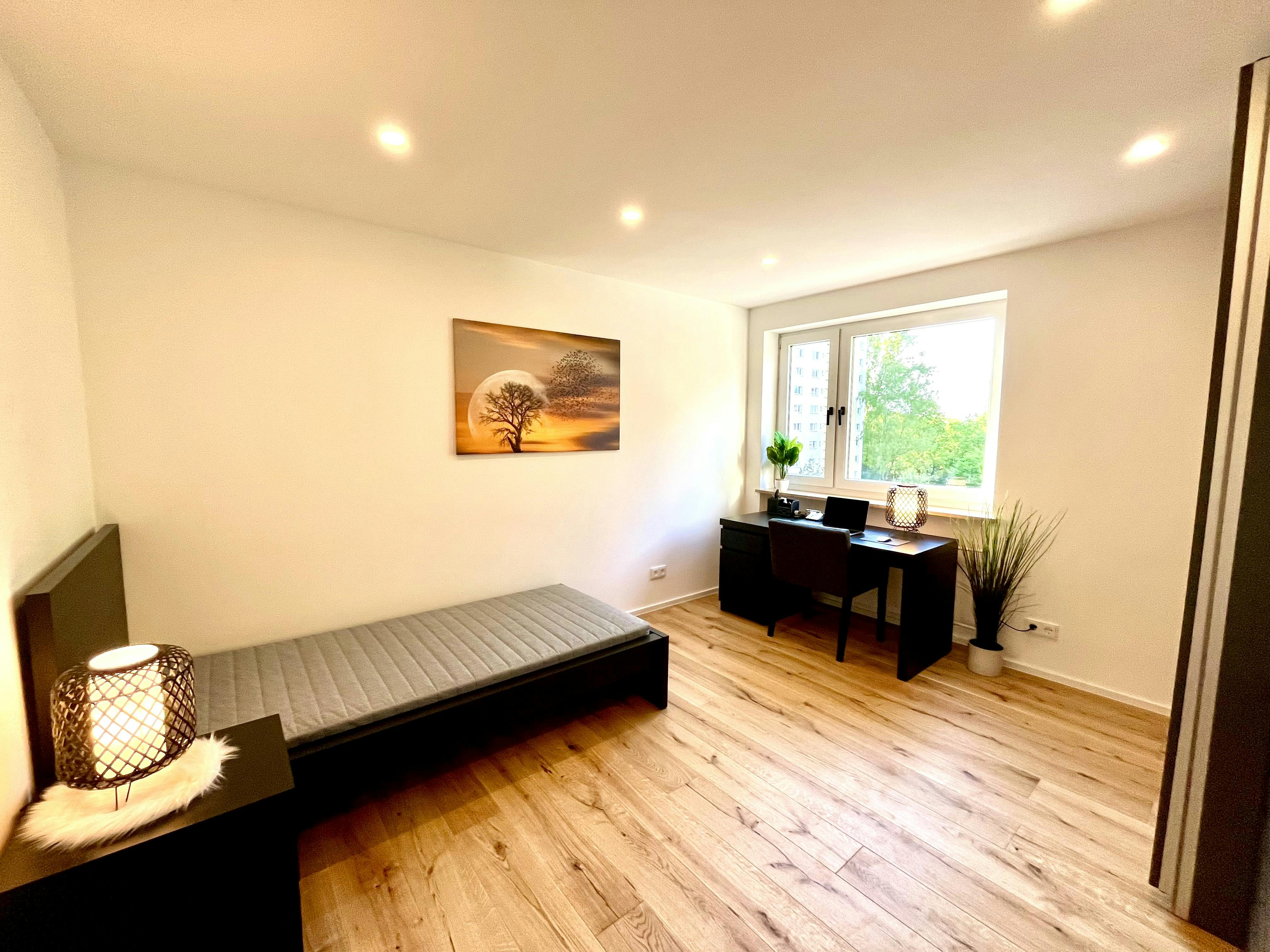 The newly and high-quality equipped room is part of a 92 sqm newly renovated apartment in Munich, Feldmoching, operated by 089apartments. The generous hallway gives a very inviting impression and provides access to all rooms of the large apartment. The apartment also has a newly furnished bathroom, with a washbasin and LED mirror, a towel radiator and a shower as well as a toilet. The comfortably furnished room has the following furniture: - 90 cm bed with with mattress protector - Large wardrobe - Desk with drawers and armchair - Decorative wall picture The table and floor lamps, plants, tv and office supplies shown in the pictures are for illustration purposes only and are not included with the rental. The kitchen offers all imaginable conveniences: - All kitchen equipment such as plates, glasses, cookware, etc. - Kettle and toaster - Dishwasher - Microwave - Induction hob, oven and extractor hood - Refrigerator - Washer-dryer The apartment is equipped with everything you need and is perfectly prepared for you to move in and feel at home immediately. Of course, you also have unlimited access to the super-fast WiFi with 100 Mbit/s. The rent already includes all costs for using your room and all common areas (no hidden costs!). Connection: The Olympia Shopping Center (short: OEZ) can be reached from here by bus number 60 in just 10 minutes. Feldmoching's excellent public transport connections continue: with the S1, you can reach the airport in about 35 minutes or the main train station in 20 minutes. You can also quickly access the A99, A92, or A95 by car. Renowned companies like BMW, MTU, and other technology firms are easily reachable from here. Within walking distance, you will find other shopping options such as bakeries, opticians, an Italian restaurant, and two pharmacies. Both the Fasaneriesee and the Lerchenauer See are about 300 and 400 meters away, respectively. What could be better than a quick evening swim in the lake or a walk or bike ride around it? This apartment combines the popular living on the outskirts with the sought-after proximity to the city...