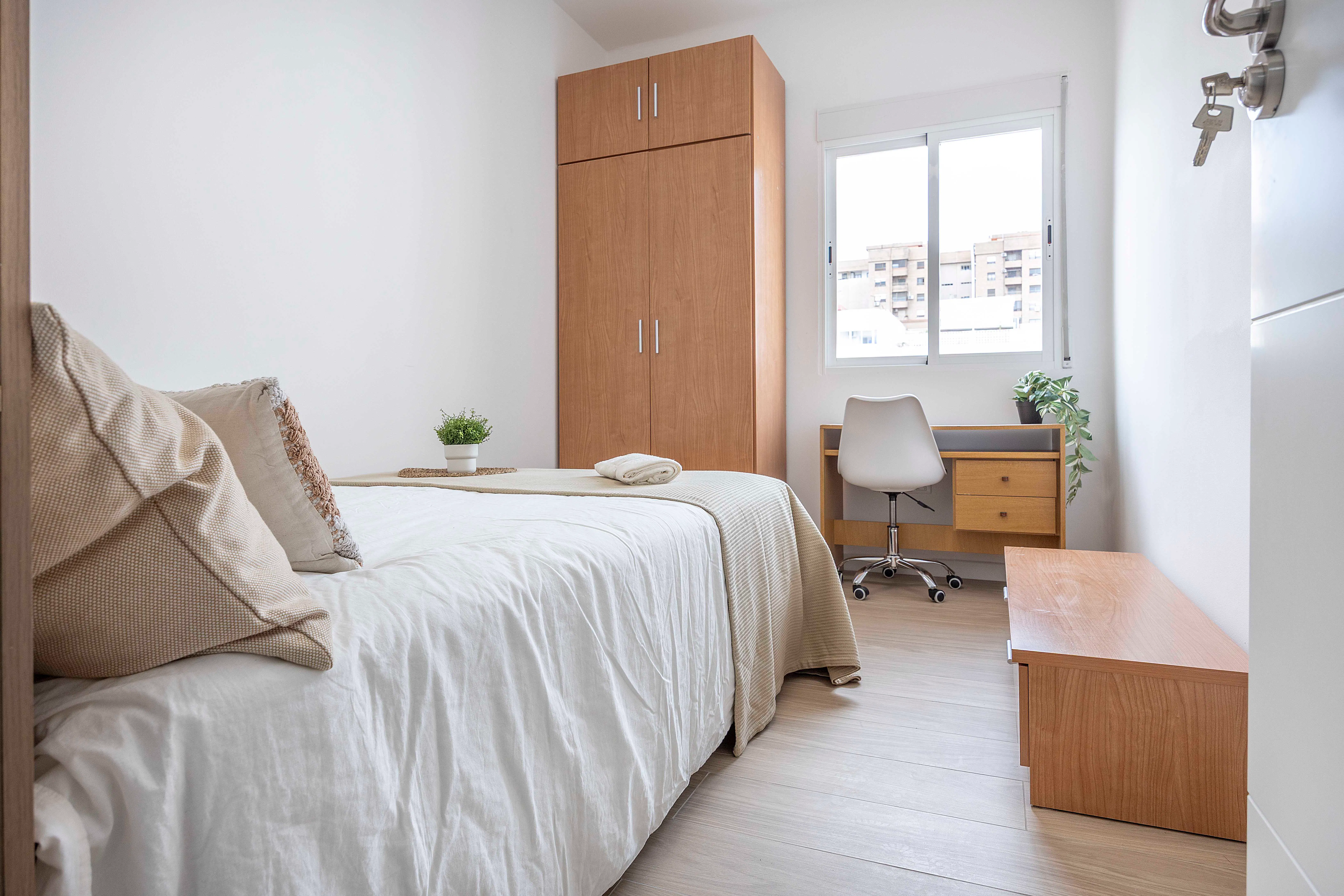 ROOM: Bright room in Amistad neighborhood, one of the best valued places to live if you are student. It's a very good option if you are student or young worker and want to spend some time in the beautiful city of Valencia. It's a totally equipped and furnished bedroom: - Bed 135x190cm - Wardrobe - Desk with chair - Ceiling fan - Window with interior view - Lock for your privacy APARTMENT: The apartment sizes 85m2 and it has 4 bedrooms, 1 common bathroom and 1 private bathroom. Therefore the bathroom is shared with 2 more people. Common areas are enough to spend time with your flatmares, with a equipped with: - gas cooker (it is being replaced by an electric one) - gas heater (it is being replaced by an electric one) - Refrigerator - Oven - Microwave - Washing machine - Tableware NEIGHBORHOOD: Amistat area is one of the greatest area to live in Valencia if you are student! This neighborhood is home to several university buildings and has great transport connections to the city centre, UPV and University of Valencia, and also to the beach! The area is plenty of bars, pubs, discos, specially for students, where you can share time with other international students. EXPENSES: The rental price includes internet and a weekly cleaning of the common areas. The costs of utilities are as follows: -Water: 10€/month -Electricity: 40€/month, if any month the consumption is more than this, the difference will be paid separately. In this case, the expenses are shared equal parts between the tenants. CLEANING SERVICE: We offer for free a cleaning service once per week of common areas. It's a tenant rensponsibility to keep the flat clean, tidy and in good conditions. Our cleaning service is mainly to help you with the cleaning, but it's important to keep everything clean. The cleaning products must be provided by the tenants. You can find a list of the cleaning products needed at the apartment. BED LINEN: For a hygienic reason, we do not provide any bed linen, neither pillow, duvetor duvet cover. CHECK IN AND CHECKOUT TIME: The check in will be at the office. Once your booking is confirmed, you will recieve details of how to arrive to the office, but is very well connected from the airport. We will meet here to complete the payments, sign the rental agreement and provide a set of keys of your new home. The check in hours will be from 4:00PM to 8:00PM. If you arrive to Valencia earlier you can leave the luggage at my office meanwhile. If you arrive later than 8:00PM we will leave your keys at a 24H point, where you will be able to collect them. The check out will be max the las day of the rental agreement at 11:00AM. If your flight is later than this hour, you can leave the luggage here at the office without cost. PUBLIC TRANSPORT: Metro stops: - Amistat Casa salut - Ayora - One of the advantages of living in Valencia is that you have the option of cycling by Valenbisi. For a minimum amount per year (30€) you have the option to cycling around Valencia with an ecological and healthy challenge available 24 hours 365 days in a year .It's easy to use: log in with your Valenbisi target in one of the more than 275 parking bikes, take one and move around the city freely. When you arrive to the destiny, you will find one parking near, and the only thing you have to do is park the bike and enjoy the city...