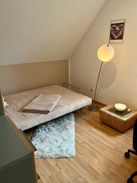 Hallo liebe Interessierte, wir bieten ein schönes helles und ruhiges Zimmer in einem Doppelhaus mit Garten mit neuem Bad (Mitnutzung) an zwecks WG mit flexiblen Mietdaten. Das Zimmer befindet sich in Hamburg Volksdorf und wenige Minuten von der U1 sowie dem Busbahnhof entfernt. In weniger als 30 Minuten gelangt man zum Hauptbahnhof. Parkmöglichkeiten gibt es direkt vor dem Haus. Die Gegend besticht durch sehr schöne Natur (Wald, See, Naturschutzgebiete) sowie die tolle Dorf-Lage (ebenfalls in 10 m erreichbar). Nicht nur der große Markt (mittwochs und samstags), sondern auch der Dorfkern mit vielen Einkaufsmöglichkeiten, Sportplätzen- und Clubs sowie Ärzten, Restaurants, Bars, Cafés lädt zum Verweilen ein. Zudem ist das AEZ (Alster Einkaufszentrum) mit dem Bus nur ca. 20 m entfernt. 🛏️ Das Zimmer und weitere Nutzungsmöglichkeiten Das Zimmer ist 10 m2 groß, befindet sich im ersten Geschoss. Es ist voll möbliert (Bett, Couchtisch, Schreibtisch und - Stuhl, Stehlampe, Deckenlampe, Teppich, Schrank. Ab 1.3.2026 wird es zur Miete angeboten. Die neue Küche bietet sämtlichen Komfort. Weiterhin befindet sich im Keller eine separate Waschmaschine zur Nutzung. 👩👨 Du würdest mit uns - Kerstin und Carlos (53) unter einem Dach leben. Hier wird Deutsch und Spanisch gesprochen, Englisch oder auch Französisch wäre auch verfügbar ;-) Wir sind unternehmungslustig und offen. Unsere Wunschvorstellung: Gerne möchten wir mit jemandem das Haus teilen, der /die ebenfalls offen, zuverlässig und ordentlich ist. Melde dich gerne, wenn du noch Fragen hast oder auch von dir erzählen möchtest. Bis vielleicht bald 🤗...