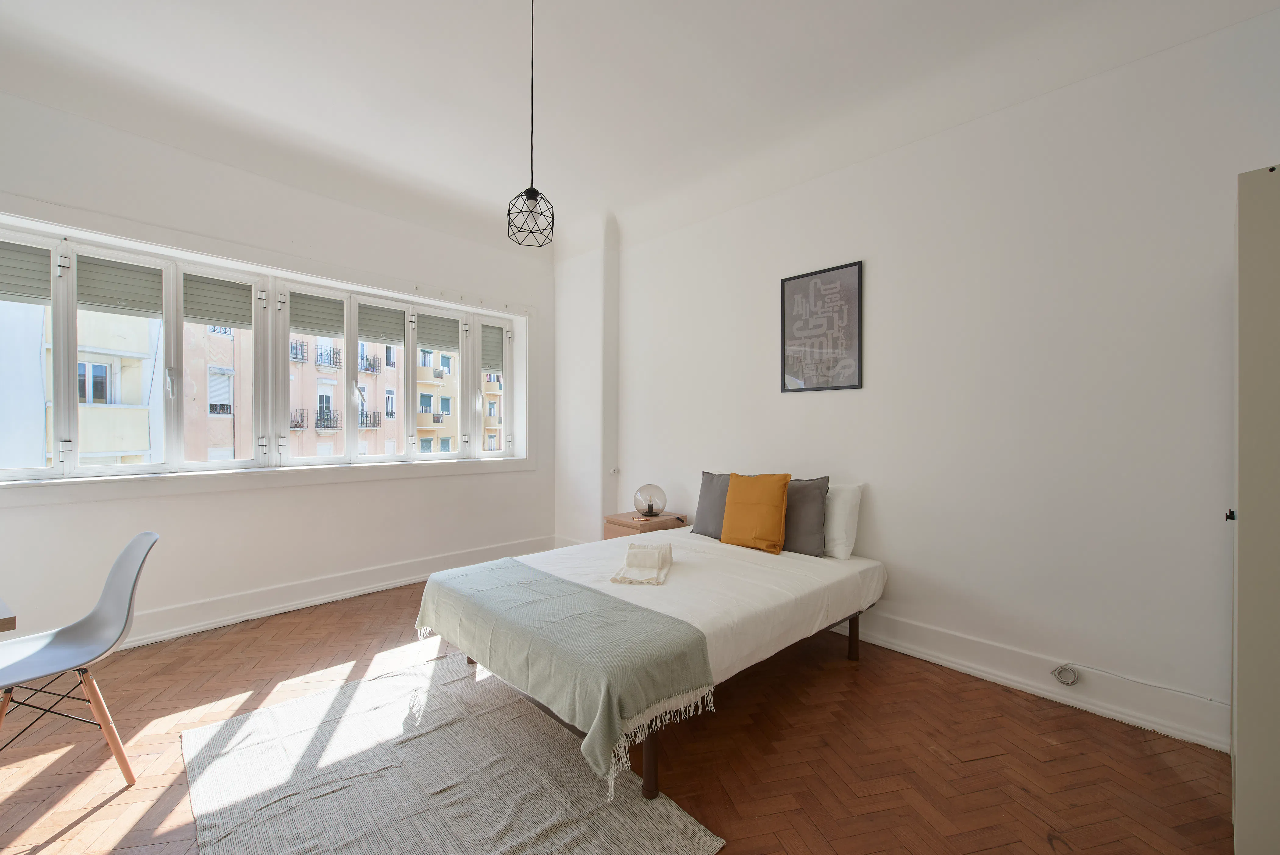 Zone: The Rua do Forno de Tijolo area is known for its charming architecture and cultural spots. It reflects the city’s rich cultural heritage, with traditional buildings and narrow cobblestone paths (calçada portuguesa) that capture the essence of the old Lisbon. The area often attracts visitors looking for an authentic experience, perfect for working in the city or working from home. Metro: 2 min walk (140m) Anjos Bus: 1 min walk (45m) Rua do Forno do Tijolo Train: Not applicable Flat description: 7-bedroom flat on the 4th floor, featuring 2 WCs. The flat includes a windowless living room and a fully furnished kitchen equipped with a washing machine, dishwasher, and dryer. Please note that the building does not have a lift or a balcony. As a disclaimer we want to inform you that the flat comes furnished as shown in pictures or with equivalent replacements. Room: This comfortable room is fully furnished and includes a dedicated workspace equipped with a small desk, chair and a lamp. You will also find a wardrobe, a bedside table with an additional lamp and a mirror. The comfortable double bed measures 140 cm wide by 200 cm long, ensuring a restful night's sleep. This room has a wide window that provides plenty of natural light. As a disclaimer we inform you that the flat comes furnished as shown in pictures or with equivalent replacements. Others: - The rent includes 35€ per person of included bills (extras will be deducted from the security deposit). - A weekly clean of the common areas is also included in the rent. - The rooms come as shown in the pictures or with the equivalent replacements. This applies for: towels, pillows and pillowcases, furniture, lamps, and all other amenities. - The rooms are for individual use, except if we have a previous agreement. - Visits are allowed, but they need to be communicated and approved in a timely manner. - All check-ins are done in person, require ID and the security deposit paid. - Check-in times during business hours are free, any other times will have to be accepted by us, and there could be a charge. - We do not allow smoking or pets in the flat. - Mandatory fee: The amount of €55 for a single bed or €65 for a double bed will be deducted from the security deposit, which corresponds to the basic linen kit that includes: sheets, pillowcases and towels. This kit can be taken by the guest at the end of their stay....