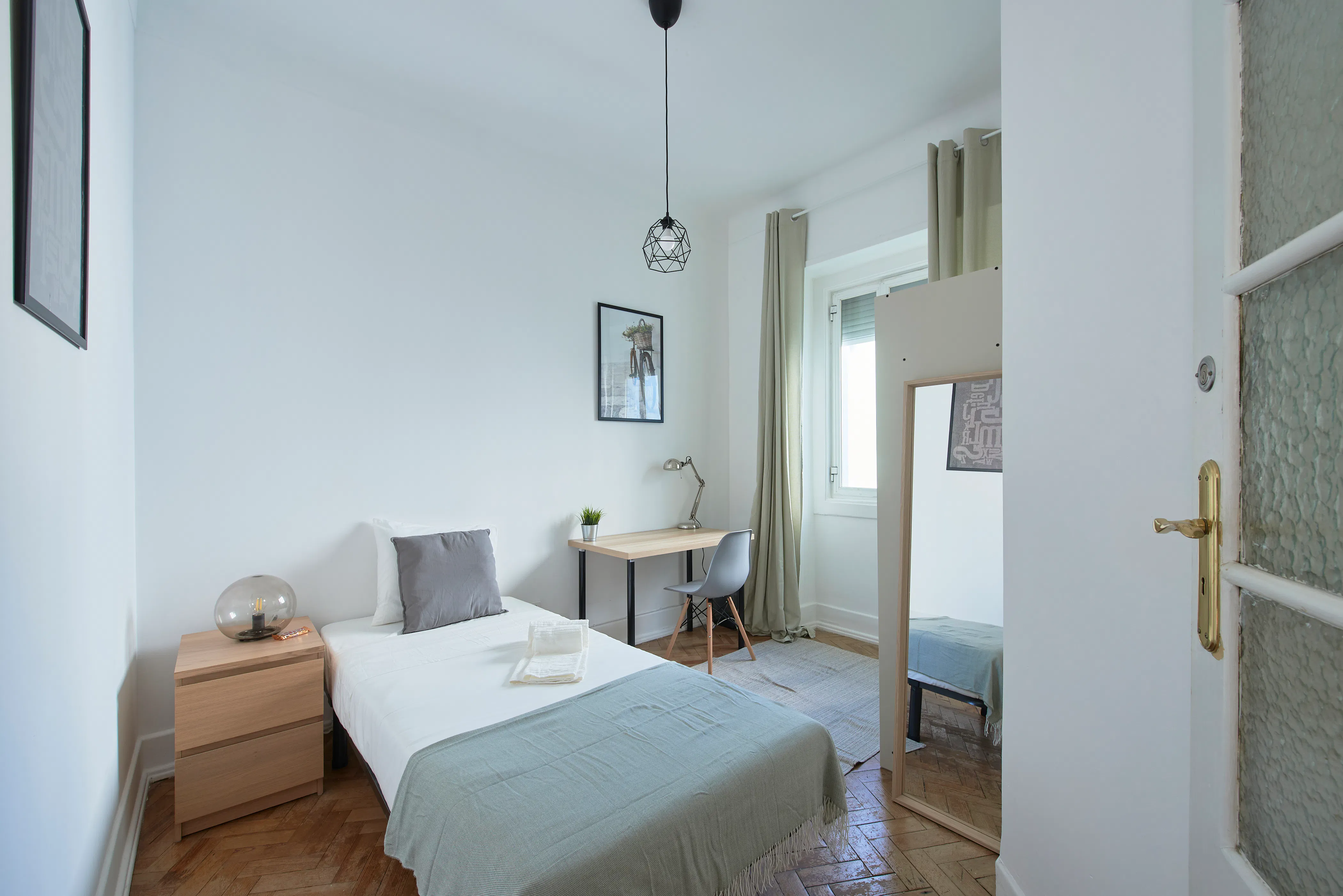 Zone: The Rua do Forno de Tijolo area is known for its charming architecture and cultural spots. It reflects the city’s rich cultural heritage, with traditional buildings and narrow cobblestone paths (calçada portuguesa) that capture the essence of the old Lisbon. The area often attracts visitors looking for an authentic experience, perfect for working in the city or working from home. Metro: 2 min walk (140m) Anjos Bus: 1 min walk (45m) Rua do Forno do Tijolo Train: Not applicable Flat description: 7-bedroom flat on the 4th floor, featuring 2 WCs. The flat includes a windowless living room and a fully furnished kitchen equipped with a washing machine, dishwasher, and dryer. Please note that the building does not have a lift or a balcony. As a disclaimer we want to inform you that the flat comes furnished as shown in pictures or with equivalent replacements. Room: This comfortable room is fully furnished and includes a dedicated workspace equipped with a small desk, chair and a lamp. You will also find a wardrobe, a bedside table with an additional lamp and a mirror. The comfortable single bed measures 90 cm wide by 200 cm long, ensuring a restful night's sleep. This room has a window that provides plenty of natural light. As a disclaimer we inform you that the flat comes furnished as shown in pictures or with equivalent replacements. Others: - The rent includes 35€ per person of included bills (extras will be deducted from the security deposit). - A weekly clean of the common areas is also included in the rent. - The rooms come as shown in the pictures or with the equivalent replacements. This applies for: towels, pillows and pillowcases, furniture, lamps, and all other amenities. - The rooms are for individual use, except if we have a previous agreement. - Visits are allowed, but they need to be communicated and approved in a timely manner. - All check-ins are done in person, require ID and the security deposit paid. - Check-in times during business hours are free, any other times will have to be accepted by us, and there could be a charge. - We do not allow smoking or pets in the flat. - Mandatory fee: The amount of €55 for a single bed or €65 for a double bed will be deducted from the security deposit, which corresponds to the basic linen kit that includes: sheets, pillowcases and towels. This kit can be taken by the guest at the end of their stay....