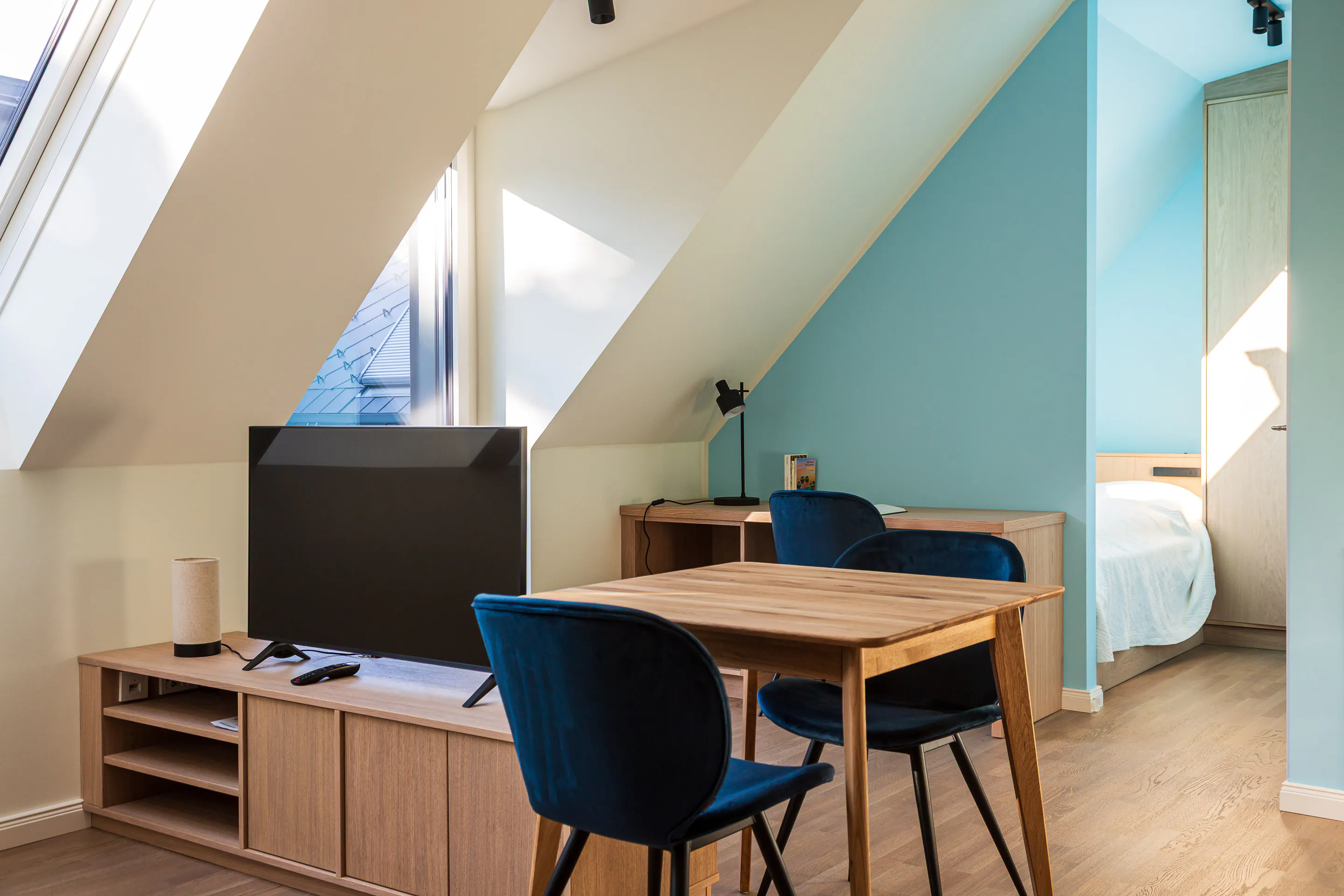 The apartment is located in one of Vienna’s greenest and most charming neighbourhoods. Just nearby lies the expansive Pötzleinsdorfer Schlosspark and the adjoining Vienna Woods — a true paradise for those seeking nature and tranquillity. Only a few minutes’ walk away, tram line 41 takes you directly to the city center in about 20 minutes. Everyday necessities are available close by: supermarkets, pharmacies, drug stores, bakeries, and gourmet food shops can be conveniently reached within just a few stops along the line. The suite: Azure blue, light-filled, sky-high — it sounds like a holiday, but it’s the everyday living experience of this rooftop oasis. Generous windows open the view to the sky. The high ceilings free the mind and enhances a sense of well-being. The refined design of the open-plan living area brings together a sofa lounge, the dining table, a workspace, the kitchen and balcony access. And there’s plenty of room for rest as well: the sleeping area is stylishly separated, while the centrally accessible bathroom ensures maximum privacy...