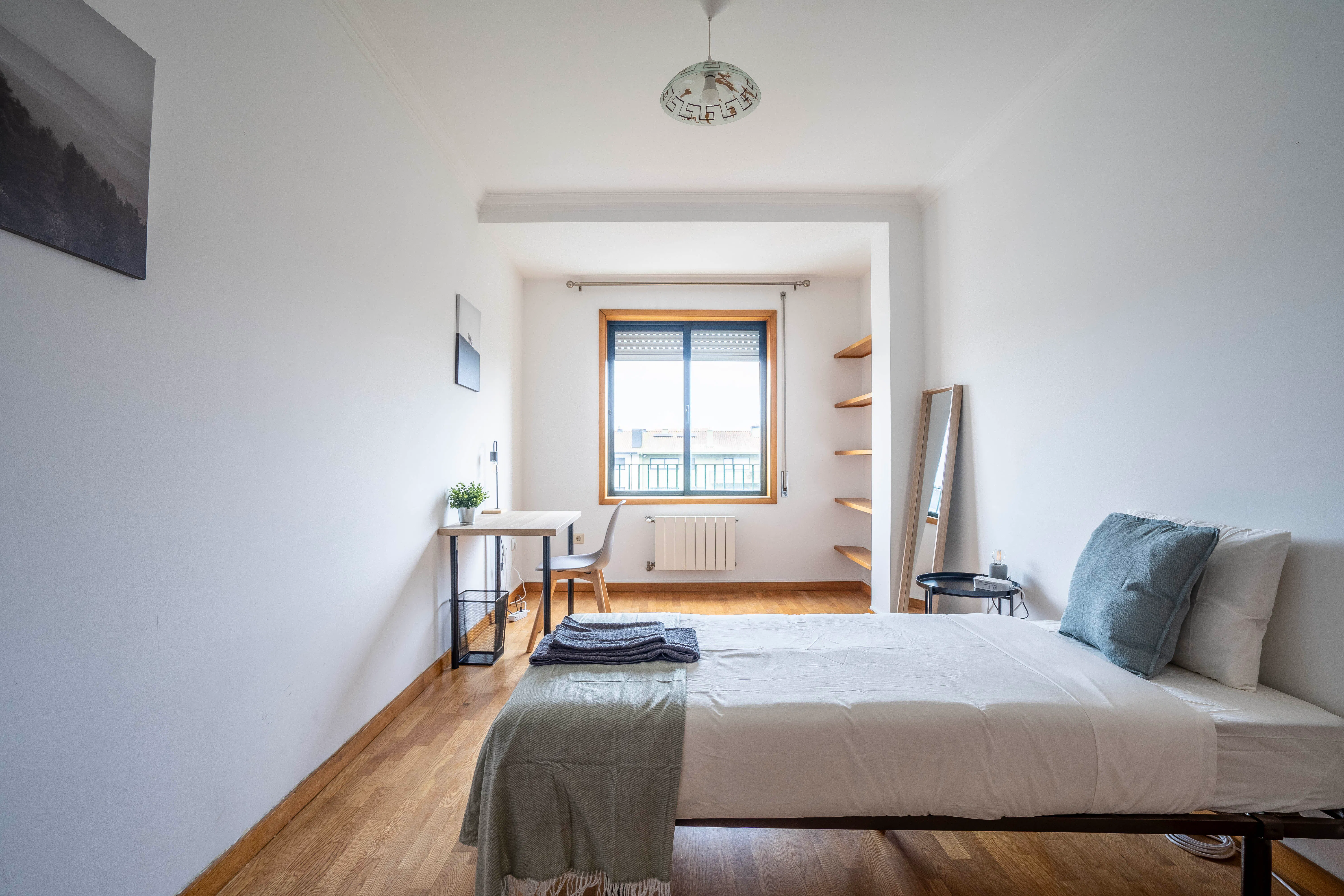 Zone: Rua Professor Sousa Júnior is located in a residential area of Porto known for its quiet and comfortable atmosphere. This part of the city offers a quiet atmosphere, making it a pleasant area for living. Metro: 22 min walk (1.7 Km) Casa da Música Bus: 4 min walk (300m) Sta. Luzia (Norte) Train: Not applicable Flat description: 5-bedroom flat located on the 2nd floor, featuring 2 WCs. The kitchen is fully furnished and comes equipped with a washing machine. The building also has a lift for easy access. Room: This charming room is fully furnished and includes a dedicated workspace equipped with a window, desk, chair, lamp, and mirror. You’ll also find a wardrobe and a bedside table with an additional lamp. The comfortable single bed measures 90 cm wide by 200 cm long, ensuring a restful night's sleep. As a disclaimer we want to inform you that the flat comes furnished as shown in pictures or with equivalent replacements. Others: - The rent includes 35€/per person of included bills (extras will be deducted from the security deposit). - A weekly cleaning of the common areas is also included in the rent. - The rooms come as shown in the pictures or with the equivalent replacements. This applies for: towels, pillows and pillowcases, furniture, lamps, and all other amenities. - The rooms are for individual use, except if we have a previous agreement. - Visits are allowed, but they need to be communicated and approved in a timely manner. - All check-ins are done in person, require ID and the security deposit paid. - Check-in times during business hours are free; any other times will have to be accepted by us, and there could be a charge. - We do not allow smoking or pets in the flat. - Mandatory fee: The amount of €55 for a single bed or €65 for a double bed will be deducted from the security deposit, which corresponds to the basic linen kit that includes: sheets, pillowcases and towels. This kit can be taken by the guest at the end of their stay....