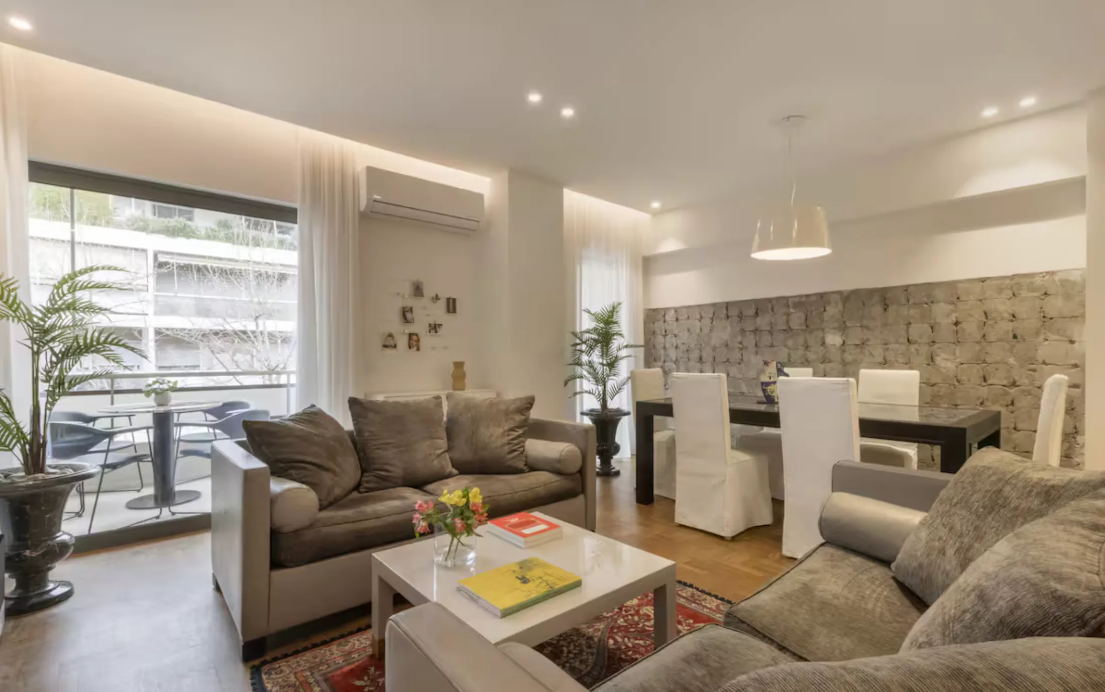 The Space On the third floor of a quiet building, on the border where the vibrant energy of Ampelokipi meets the refined tranquility of Neo Psychiko, this residence is a masterpiece of modern luxury. The interior, shaped by the aesthetic of a “Gallery of Life”, features an open layout decorated with artistic touches, herringbone wooden floors and a striking hand-carved stone wall in the dining room. The culinary studio features a sophisticated blue and marble design, fully equipped with modern appliances and a luxurious coffee station for easy hosting. Sleep is a fundamental luxury. Both spacious bedrooms, one of which has an en suite bathroom, feature king-size beds with premium American Sealy mattresses and dedicated workspaces to focus on your remote work. Replacing traditional shutters with designer blackout curtains, the space filters the light of Athens in a soft, tranquil glow. Every corner is highlighted by carefully selected gold and silver fixtures, from the spa-like showers in the two modern bathrooms to the sophisticated lighting that bathes the residence in warmth. Outside, a private terrace with a marble table offers a peaceful vantage point over the city. Connectivity is the ultimate advantage of this location, as you are just an eight-minute walk from Panormou metro station. From there, you are just four stops, or around ten minutes, from the heart of Athens at Syntagma Square and on a direct 32-minute line from the international airport. The residence is ideally located for professionals and those who value proximity to world-class healthcare, as it is minutes away from important facilities such as the Red Cross, Henry Dunant Hospital and Psychiko Clinic. For recreation, a short stroll leads to the elite enclave of Faros Psychiko for fine dining at Gaspar or authentic flavors at Faros Greek Cuisine. Alternatively, explore the legendary nightlife of Mavili Square or enjoy 360-degree views of the skyline from the nearby rooftop of Deos. Equipped with high-performance air conditioning, efficient natural gas heating and "super-efficient" window frames, the apartment remains a quiet, climate-controlled haven regardless of the pace of the city. Please be aware that HousingAnywhere is an online booking platform. Therefore exchanging contact details and offering viewings is not possible. If you would like to reserve this accommodation, send me a booking request or a message and please mention your age and occupation. I look forward to meeting you...