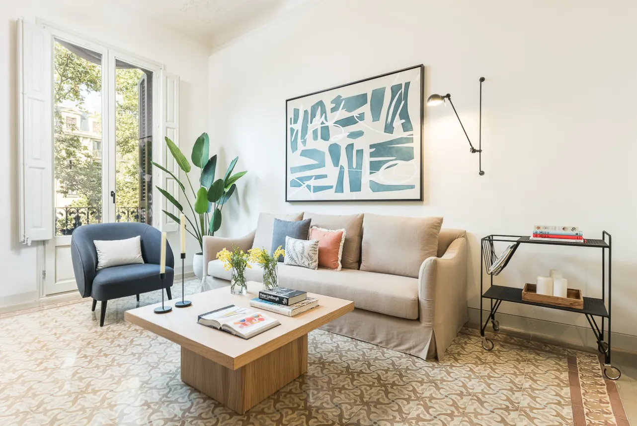 Magnifica vivienda de 2 dormitorios con una pequeña terraza exterior CONDICIONES DE ALQUILER: - Alquiler alquiler: (3.750€) - Depósito: 1 mes de depósito (devuelto al final del contrato): (3.750€) puede varias según documentación entregada - Gastos de suministro de agua, electricidad, gas e internet: incluido en el precio del alquiler - Servicio de administración: (3.750€) puede variar dependiendo de la duración del contrato DESCRIPCIÓN DE LA VIVIENDA: Ubicada en un edificio residencial con ascensor, distribuido en 75 metros cuadrados con 2 dormitorios y 2 baños completos. El salón comedor exterior con balcón a la calle, en un mismo espacio con la cocina americana, equipada con todos los muebles (sofá, mesa pequeña, mueble de TV, televisor, mesa de comedor con sillas). La cocina americana en muy buen estado, con todos los electrodomésticos (nevera, vitrocerámica, campana extractora, horno, microondas, lavavajillas, lavadora-secadora). Con dos dormitorios dobles. El dormitorio principal tiene una cama doble de matrimonio, mesitas de noche y armario para ropa. Con un baño completo en suite con todos los sanitarios. El segundo dormitorio doble tiene dos camas individuales, mesita de noche y armario para ropa (que se pueden juntar las camas, para hacer una grande). Con un segundo baño completo con todos los sanitarios (mueble de lavabo con espejo, plato de ducha con mampara). Con un balcón exterior con una mesita con dos sillas CARACTERÍSTICAS DE LA VIVIENDA: - Aire acondicionado - Calefacción - Suelos de hidráulicos - Ventanas con aislamiento térmico - Techos con molduras clásicas - Balcón exterior UBICACIÓN: Magnífica vivienda situada en el barrio del Eixample. Rodeada de todo tipo de tiendas, bares, restaurantes, supermercados y zonas de ocio. Muy bien comunicado con medios de transporte...