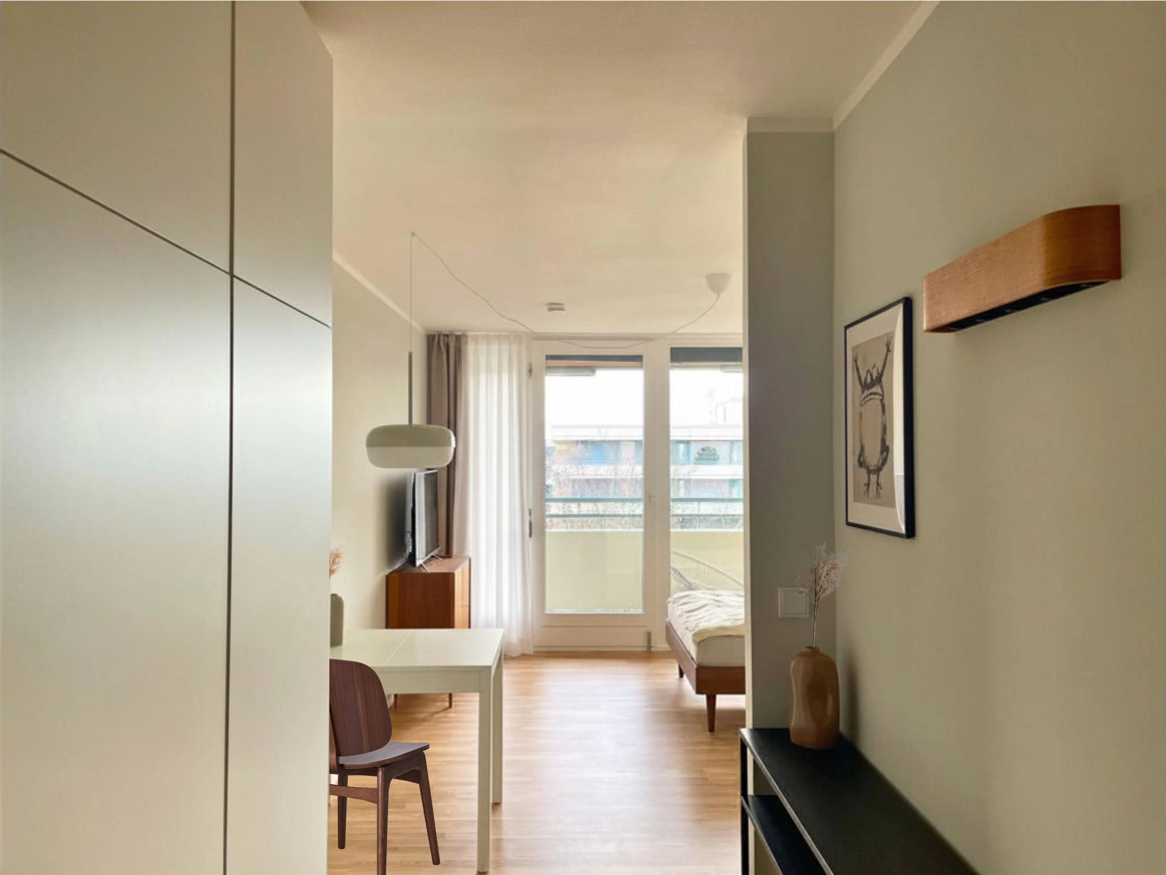 Möbliertes Wohnen auf Zeit: Neu renovierte und möblierte 1-Zimmer-Wohnung in guter Wohnlage München-Sendling inklusive Schwimmbad, Sauna und Stellplatz. * neuwertige Möblierung * kleine, moderne Einbauküche - gut ausgestattet mit Spülmaschine, Spüle, Herd und Mikrowelle mit Grillfunktion * inkl. Internet-Flatrate * Smart TV mit Sat-TV * schöner unverbauter Blick vom 7. Stock in die Berge + sonnigem Südwestbalkon * eigenes Hallenbad sowie Sauna zur gratis Benutzung * zur Haltestelle Harras U-Bahn U6 und S-Bahn sind es ca. 12 Minuten zu Fuß, Bushaltestelle 54 und 123 ca. 5 Minuten zu Fuß Ausstattung Kombiniertes Wohn-/Schlafzimmer: 1,40m breites Bett, Schrankwand, Parkettboden, Sat-TV, vollausgestattete Einbauküche mit Ceran-Kochfeld, Mikrowelle mit Grill, Spülmaschine, Kühlschrank und Dunstabzugshaube, Schreibtisch, Sitzecke, neu renoviertes Bad mit Dusche und Waschmaschine, WLAN. Münztrockner im Keller verfügbar. Eigenes Kellerabteil. Schwimmbad (12,50 m lang) sowie Sauna zur Gemeinschaftsbenutzung im Haus. Lage Das Haus selbst liegt in einer sehr ruhigen und grünen Wohnanlage mit eigenem Schwimmbad und Sauna. Rund um die Wohnung befinden sich verschiedene Geschäfte (Bäckerei, Rossmann, Penny, Real etc.) und Restaurants. U-Bahn: Linie U6, Haltestelle Partnachplatz (13 Minuten zu Fuß) S-Bahn: Linien S20 und S7, Haltestelle Mittersendling (11 Minuten zu Fuß) Bus: Linien 132, 53 und N41, Haltestelle Johann-Clanze-Straße (7 Minuten zu Fuß) Linien 134, 54 und N43, Haltestelle Heckenstallerstraße (8 Minuten zu Fuß) Linie 132, Haltestelle Friedrich-Hebbel-Strasse (5 Minuten zu Fuß) Sonstiges Die Wohnung ist stufenfrei erreichbar...