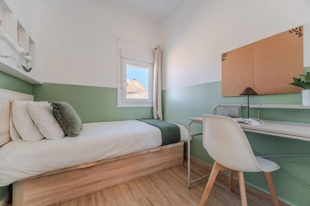 Wonderful building in Puente de Vallecas This building features *27 rooms and 9 bathrooms* , distributed across *4 floors* , offering a comfortable and functional layout. Residents on floors *0 and 1* share the common areas located on floor 0, while those on floors *2 and 3* have their own shared spaces on floor 2, ensuring a more organized and practical living environment. The property includes stair access and *two fully equipped kitchens* , complete with stovetops, refrigerators, oven, microwave, kitchenware, and dining areas. Additionally, the building offers *two outdoor spaces* : one at the entrance and a spacious rooftop terrace measuring 34.70 m2, perfect for relaxing or socializing. It is an ideal option for *international students and young professionals* , a unique opportunity to enjoy life in Madrid. Located southeast of Madrid’s city center, *Puente de Vallecas* is one of the city’s most distinctive and authentic neighborhoods. Just minutes from the center, it combines proximity to areas such as *El Retiro Park* and *Atocha Station* with its own dynamic atmosphere that is constantly evolving. The district offers a wide range of services, including healthcare centers, shopping areas, and green spaces such as *Cerro del Tío Pío* , well known for its panoramic views of Madrid. * The nearest metro station is *Puente de Vallecas Metro Station* (Line 1), just a few minutes’ walk away, offering direct access to Madrid city center. * The area is served by *several bus lines* , ensuring convenient and fast connections to different parts of the city. * It also provides easy access to *Cercanías Renfe (lines C5 and C10).* *Asamblea de Madrid–Entrevías station* is approximately a 10–11 minute walk away. *Méndez Álvaro station* is around a 15–16 minute walk. * Among its main attractions is the *Cerro del Tío Pío* , one of Madrid’s most well-known viewpoints, famous for its stunning panoramic views, especially at sunset. * It also features cultural spaces such as the *Centro Cultural Lope de Vega* , where activities, exhibitions, and events are held throughout the year. - Don't smoke - Pets are not allowed - Parties are forbidden - Take out the trash daily - Short-term visits are allowed - (hidden) informs that in this flat a device has been installed in order to allow the monitoring of the noise level (decibels) 24 hours a day. The system emits an alert whenever the sound level exceeds the maximum allowed by the Community of Madrid, mainly between 11pm and 6am. Cozy room in Puente de Vallecas Cozy room in *Puente de Vallecas* in a shared apartment, ideal for international students and young professionals. The room is equipped with everything you need to enjoy your stay: it features a single bed ( *90 cm* ), a spacious double wardrobe, air conditioning that also works as heating, and a desk with a chair and lamp. The room size is *6.00 m2*. It has a window and also includes its own lock on the door for added privacy. This room is located on the second floor of the building and has access to the four bathrooms located in the common areas. The kitchen and dining room are shared exclusively among tenants on the 2nd and 3rd floors. For more details, we invite you to view the floor plan and check the location of the room on the 2nd floor. *Bed linen is not included; only a mattress cover is provided.* Please keep in mind that the amount requested in the "other additional costs" field refers to tenant assistance coverage....