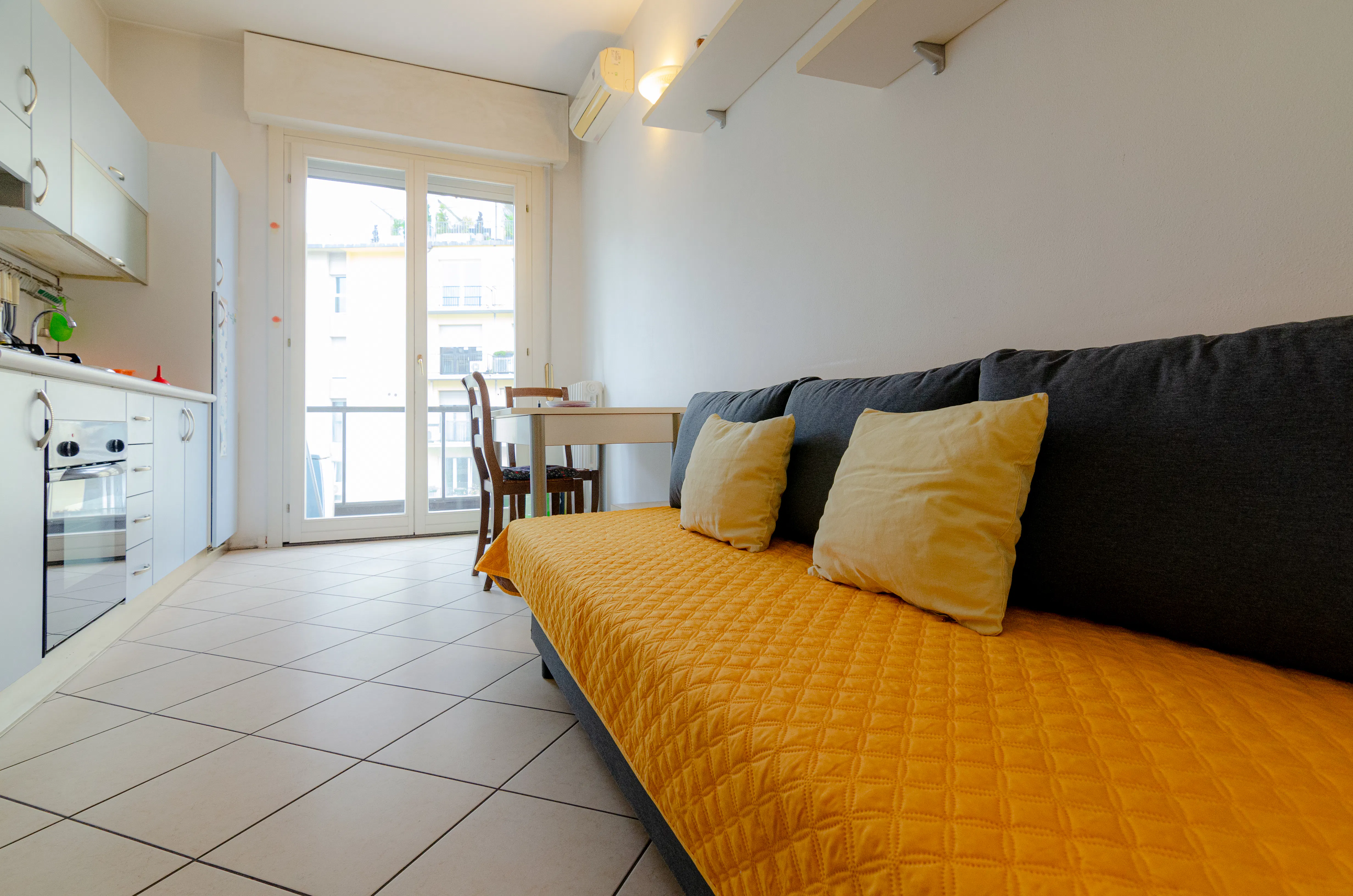 Quiet and centrally located apartment in the historic center of Bologna, within easy walking distance of the city’s main attractions. It consists of an entrance hall leading to a living room with a sofa bed, a Smart TV, a fully equipped kitchen, a balcony connected to the bedroom, a double bedroom with a closet and a desk, a full bathroom with a shower and a washing machine, air conditioning, and unlimited Wi-Fi throughout the apartment. It will be the perfect base for discovering the City of Bologna. The apartment is located on the 5th floor of a building with an elevator, so it will not be necessary to take any flights of stairs to reach the apartment...
