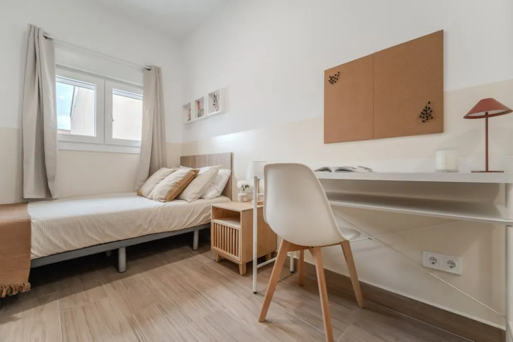 Wonderful building in Puente de Vallecas This building features *27 rooms and 9 bathrooms* , distributed across *4 floors* , offering a comfortable and functional layout. Residents on floors *0 and 1* share the common areas located on floor 0, while those on floors *2 and 3* have their own shared spaces on floor 2, ensuring a more organized and practical living environment. The property includes stair access and *two fully equipped kitchens* , complete with stovetops, refrigerators, oven, microwave, kitchenware, and dining areas. Additionally, the building offers *two outdoor spaces* : one at the entrance and a spacious rooftop terrace measuring 34.70 m2, perfect for relaxing or socializing. It is an ideal option for *international students and young professionals* , a unique opportunity to enjoy life in Madrid. Located southeast of Madrid’s city center, *Puente de Vallecas* is one of the city’s most distinctive and authentic neighborhoods. Just minutes from the center, it combines proximity to areas such as *El Retiro Park* and *Atocha Station* with its own dynamic atmosphere that is constantly evolving. The district offers a wide range of services, including healthcare centers, shopping areas, and green spaces such as *Cerro del Tío Pío* , well known for its panoramic views of Madrid. * The nearest metro station is *Puente de Vallecas Metro Station* (Line 1), just a few minutes’ walk away, offering direct access to Madrid city center. * The area is served by *several bus lines* , ensuring convenient and fast connections to different parts of the city. * It also provides easy access to *Cercanías Renfe (lines C5 and C10).* *Asamblea de Madrid–Entrevías station* is approximately a 10–11 minute walk away. *Méndez Álvaro station* is around a 15–16 minute walk. * Among its main attractions is the *Cerro del Tío Pío* , one of Madrid’s most well-known viewpoints, famous for its stunning panoramic views, especially at sunset. * It also features cultural spaces such as the *Centro Cultural Lope de Vega* , where activities, exhibitions, and events are held throughout the year. - Don't smoke - Pets are not allowed - Parties are forbidden - Take out the trash daily - Short-term visits are allowed - (hidden) informs that in this flat a device has been installed in order to allow the monitoring of the noise level (decibels) 24 hours a day. The system emits an alert whenever the sound level exceeds the maximum allowed by the Community of Madrid, mainly between 11pm and 6am. Bright double room in Puente de Vallecas Bright double room in *Puente de Vallecas* in a shared apartment, ideal for international students and young professionals. The room is equipped with everything you need to enjoy your stay: it has a double bed ( *135* *cm* ), a large wardrobe , air conditioning that also works as heating, a desk with chair and lamp, and a bedside table. The size of the room is *15.27 m2* and it has its own lock on the door for greater privacy. This room is located on the first floor of the building and has access to the four bathrooms located in the common areas. The kitchen and dining room are shared exclusively with the tenants of the 1st and ground floors. For more details, we invite you to view the floor plan of the apartment and check the location of the room on floor 1. *Bed linen is not included; only the mattress cover is provided.* Please keep in mind that the amount requested in the "other additional costs" field refers to tenant assistance coverage....