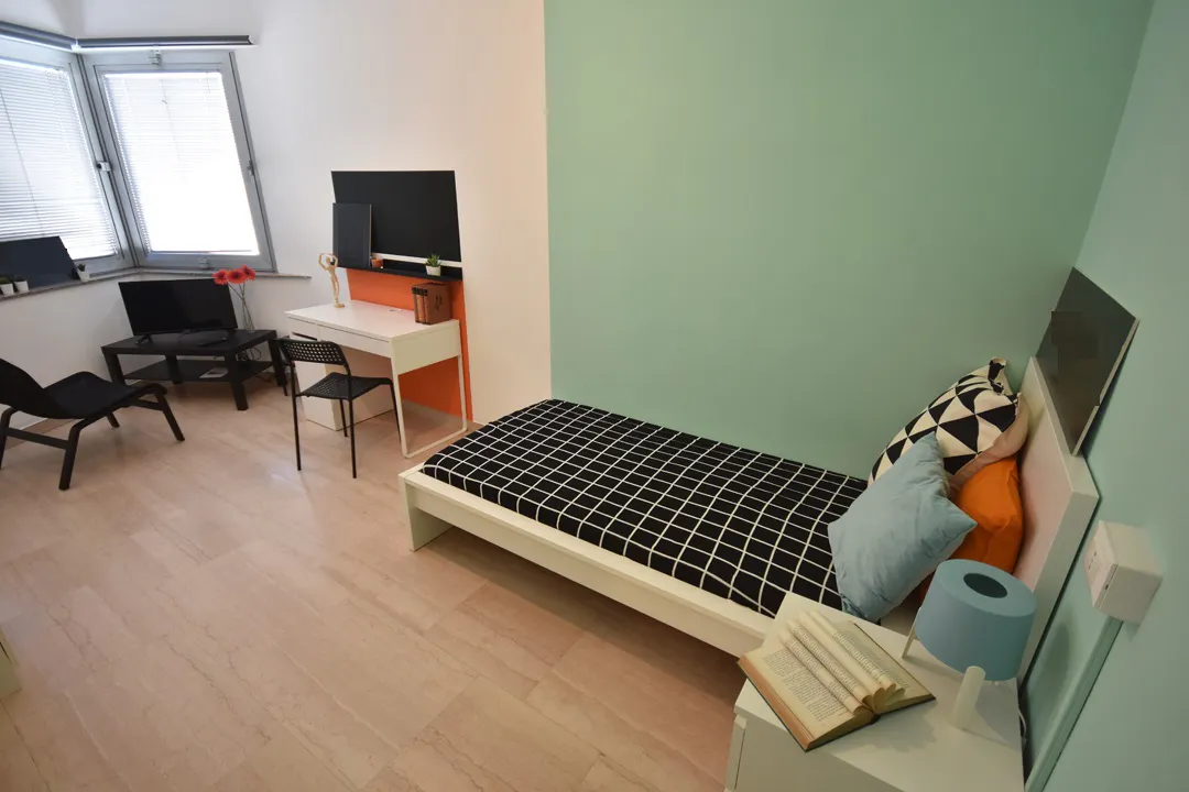 Zona Centro, posizione strategica e ambita, si affitta una bellissima suite ristrutturata appositamente per offrire comfort e comodità ai nostri studenti. La è dotata di presa tv, letto singolo, armadio 3 ante, scrivania con portaoggetti, comodino, tendaggi, specchio, libreria e mobile con tv led. I colori delle pareti favoriscono il buon umore e aiutano nello studio...