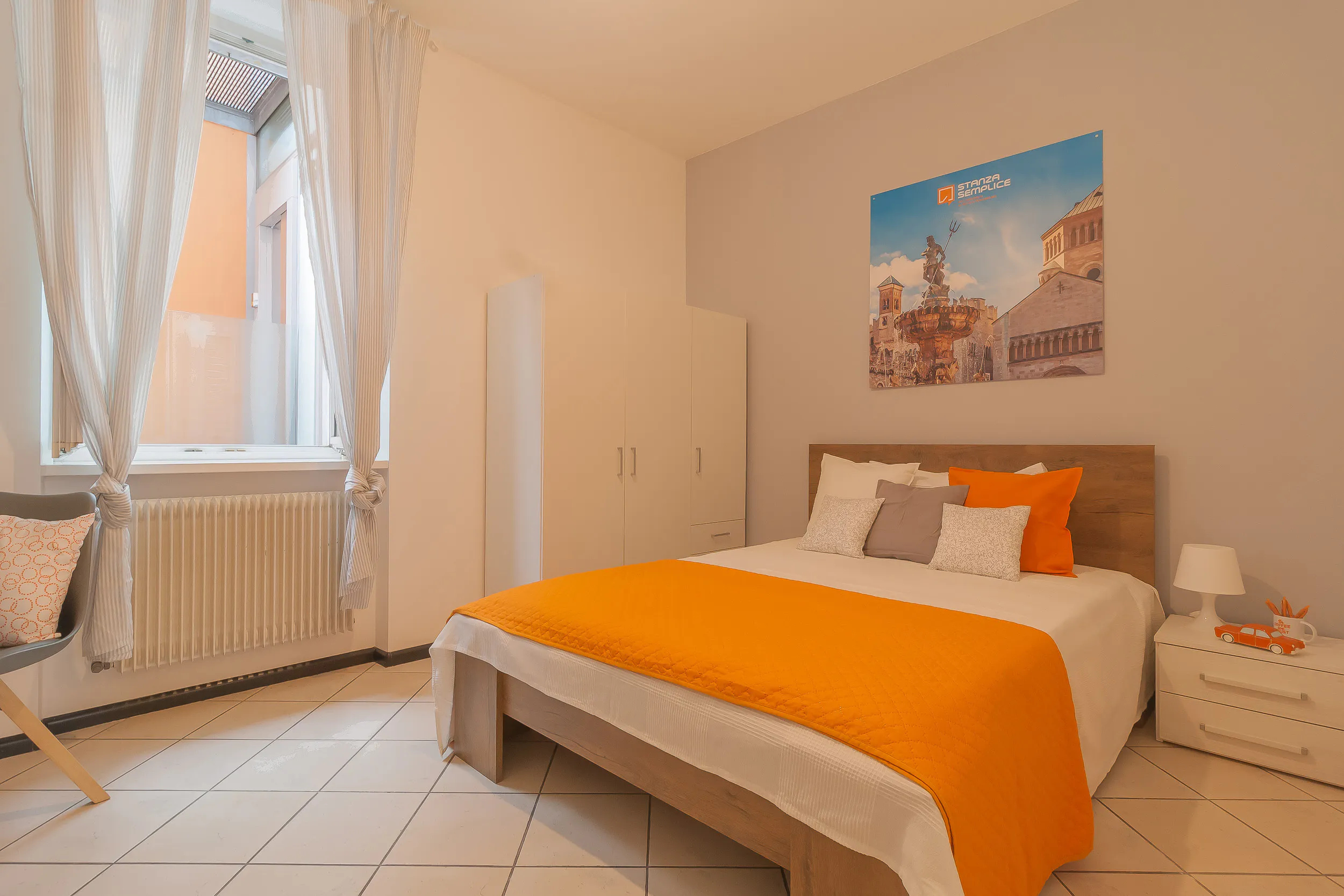 singola fresca d'estate e calda d'inverno con tutti i confort di una suite a un prezzo inferiore. Composta da letto una piazza e mezzo, scrivania e sedia, comodino, armadio 3 ante, libreria, scarpiera. I colori delle pareti favoriscono il buon umore e aiutano nello studio...