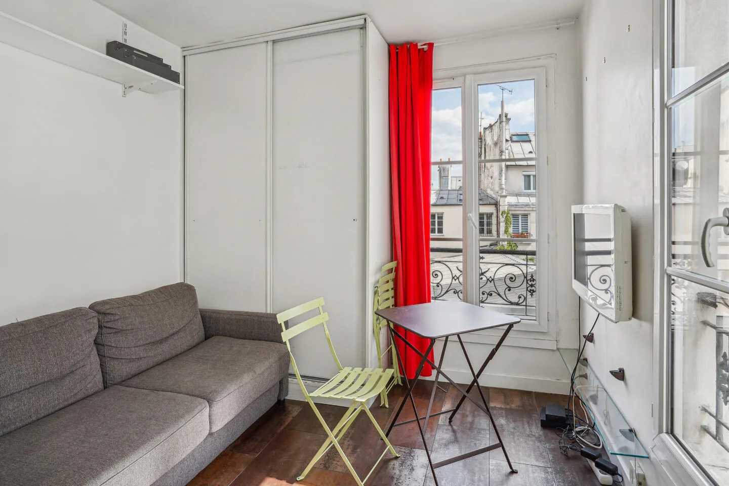 Situated on the lively Rue Chapon in the heart of Paris’s historic Arts et Métiers/ Marais district, this apartment exudes quintessential Parisian character. With high ceilings and well proportioned windows that open to a picturesque courtyard, the apartment creates a serene hideaway amid the hustle of the city. The classic wrought iron balcony railings and crisp white walls enhance the sense of light and space, while the parquet style flooring imparts subtle charm and warmth. Efficiently organized within a modest footprint, the apartment cleverly combines living, sleeping, and minimal kitchen space in one cohesive environment. A convertible sofa faces two large windows, filling the room with natural daylight and offering views of neighboring rooftops. The small kitchen corner includes a sink, induction hob, microwave, and floating shelves, thoughtfully tucking into a compact alcove. The layout optimizes every square metre: sliding wardrobe doors provide storage without intruding into the living space. The configuration maximizes functionality without feeling cramped, ideal for singles or visitors seeking Parisian authenticity. Nestled in the animated quartier, Rue Chapon places you within arm’s reach of trendy boutiques, artisanal cafés, and renowned galleries. The nearby Marché des Enfants Rouges and Place des Vosges offer both charm and convenience, while historic landmarks such as the Carnavalet Museum and Hôtel de Ville enrich the cultural experience. With the Haut Marais’s fashionable eateries just around the corner and several metro lines close at hand, this location blends traditional Parisian elegance with vibrant urban living...