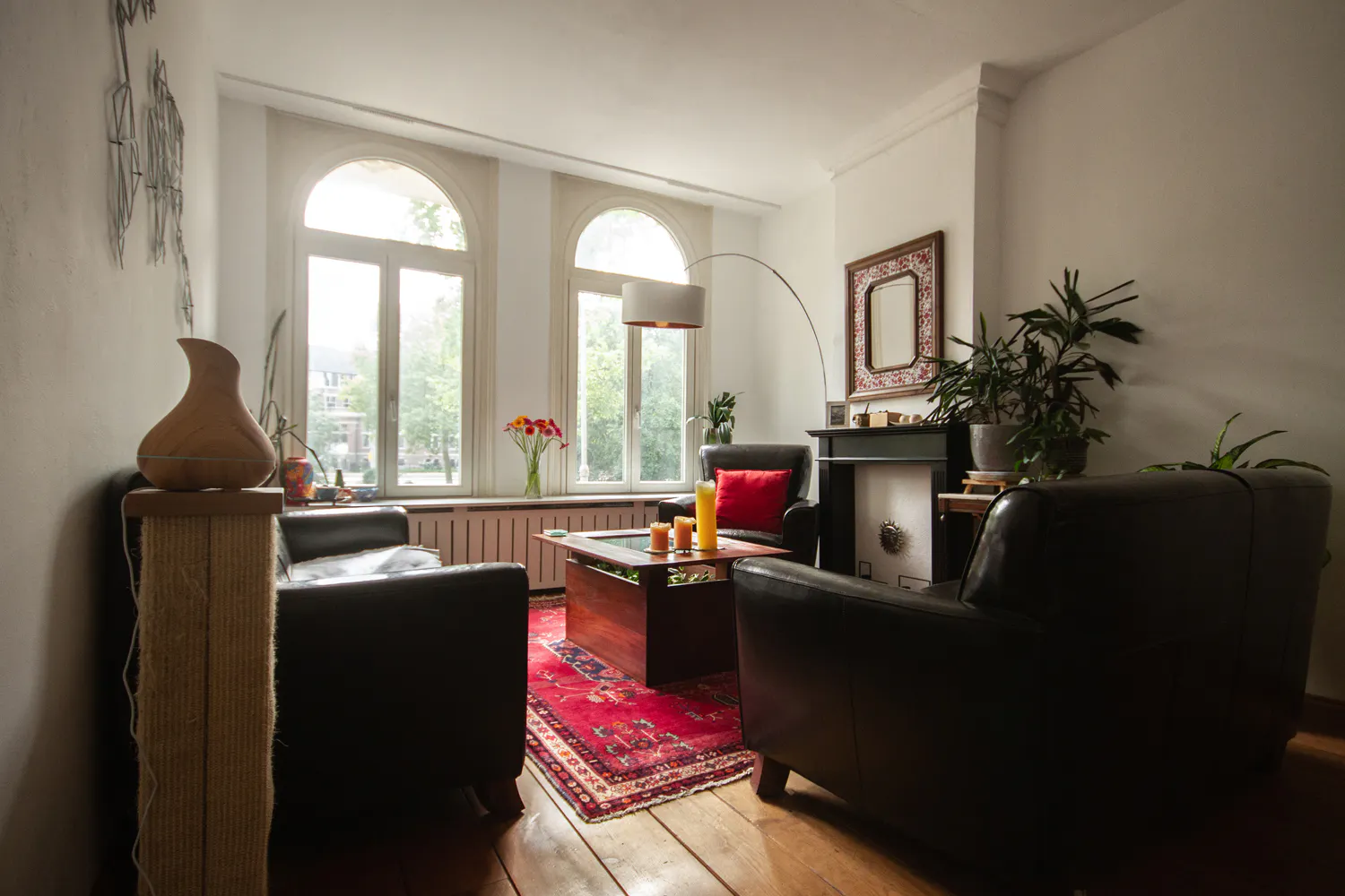 2 bedroom 100 m2 canal house apartment on ground and first floor. Beautiful historic details: stained glass & ceiling relief. Great view of a canal and the Tropen Museum. Central Amsterdam yet quiet and calm. The bathroom was recently renovated and includes a heated floor. The apartment is centrally located but on a quiet street. It is within walking distance to restaurants, stores, a park, and public transportation. The street always has street parking available on it (a rare anomaly in Amsterdam...