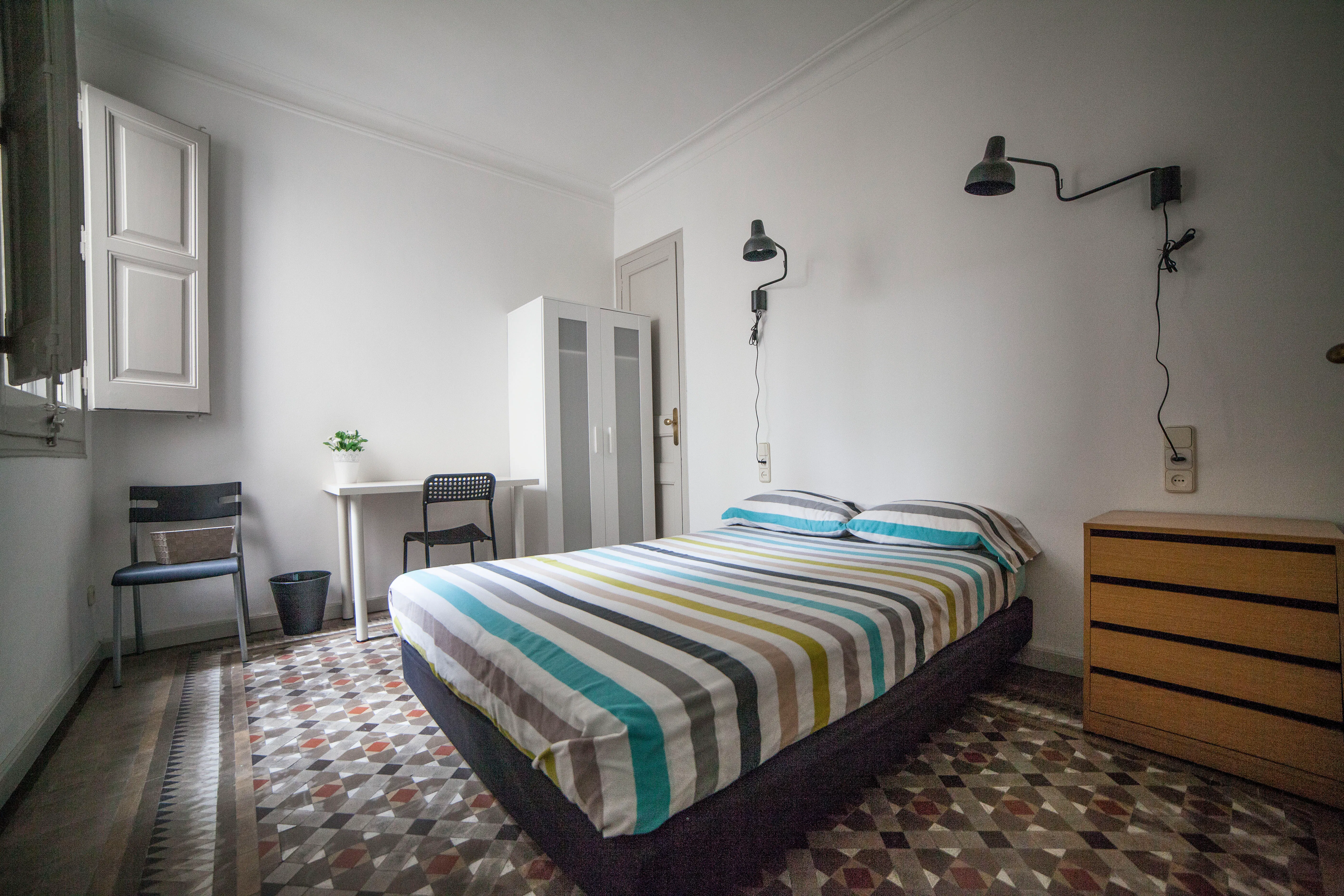 B41H5 A quiet and nice private room in a shared flat for students. This apartment is located on the 4th floor (Real 5th floor) of a modernist building with elevator in the Eixample district. It is very well connected as it is in the centre of the city. Only 3 minutes away from Passeig de Gracia (L2, L3, L4 and Renfe Rodalies) Diagonal (L5) and less than 8 minutes from Plaça Catalunya. This room is fully equipped with a double bed and mattress, a two-door wardrobe, a functional study area with a desk and chair. The flat has 6 private rooms, 1 bathroom with 3 showers and a toilet, 1 toilet room, a kitchen, and a spacious living and dining room. The common areas of the flat are shared among the tenants. We provide basic kitchen utensils and basic household appliances like a washing machine. 50€ for expenses are included in the monthly price (electricity, water and gas, WiFi internet access). This apartment is a perfect choice for you to meet new people in (hidden). A great environment is guaranteed! *Overnight guests allowed with certain rules. *No agency fees. Our requirements: 1. You must be studying or doing an internship in (hidden) 2. You must be younger than 30 3. We require a minimum stay of 4 months. 3. A transfer of the deposit 600€ is needed to complete the booking. This deposit will be returned at the end of your stay if the room is in good conditions. 4. You must be willing to share the flat with people from different cultures and backgrounds. We encourage you to create a friendly environment! We would be very happy to host you in one of our rooms during your stay in barcelona...