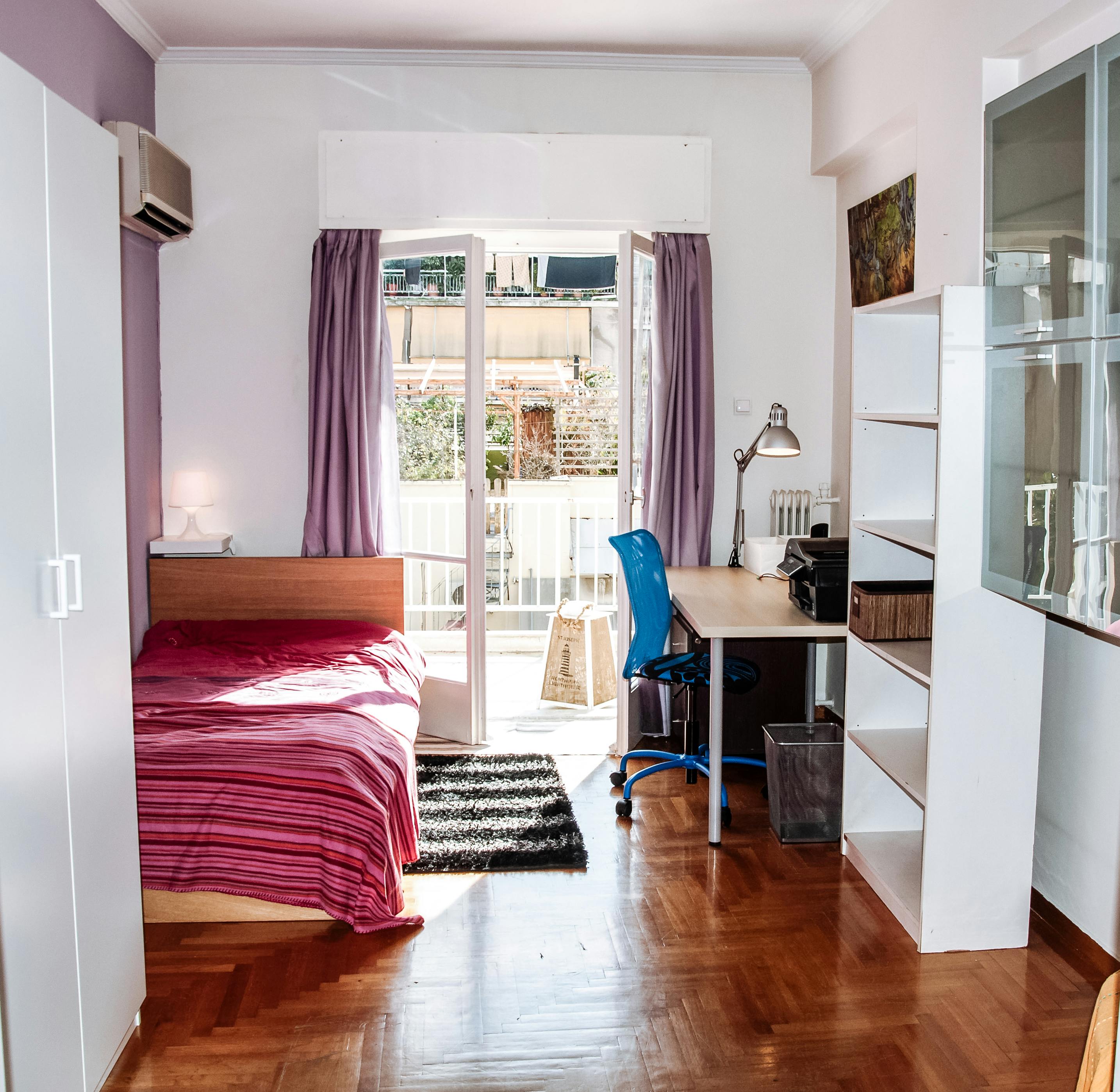A spacious and sunny 85 sq.m. apartment in the centre of Athens, in close proximity to most Universities – a leisurely 16 minute walk to the Athens University of Economics and Business (AUEB). The apartment has three independent fully-furnished bedrooms with wooden flooring, desk + lamp, office chair, bed (single to king-size depending on the bedroom), cupboard and bookcase. Two of the bedrooms have an air-conditioning unit while the smaller third one has an electrical heater. There is also a common area / living room leading to a separate very large fully equipped kitchen (which also contains a washing machine). Fast and consistent Wireless Wi-Fi (with unlimited data plan) as well as all utility bills (electricity, water, air conditioning) are included in the price of the rooms. PRICES: ROOM #2: 370 / month The second largest bedroom in the flat, directly connected to the living area with two double doors, it comes with a desk + office chair, bookcase, cupboard, airconditioning unit and double doors leading out to the same balcony as bedroom #1. All bills included...