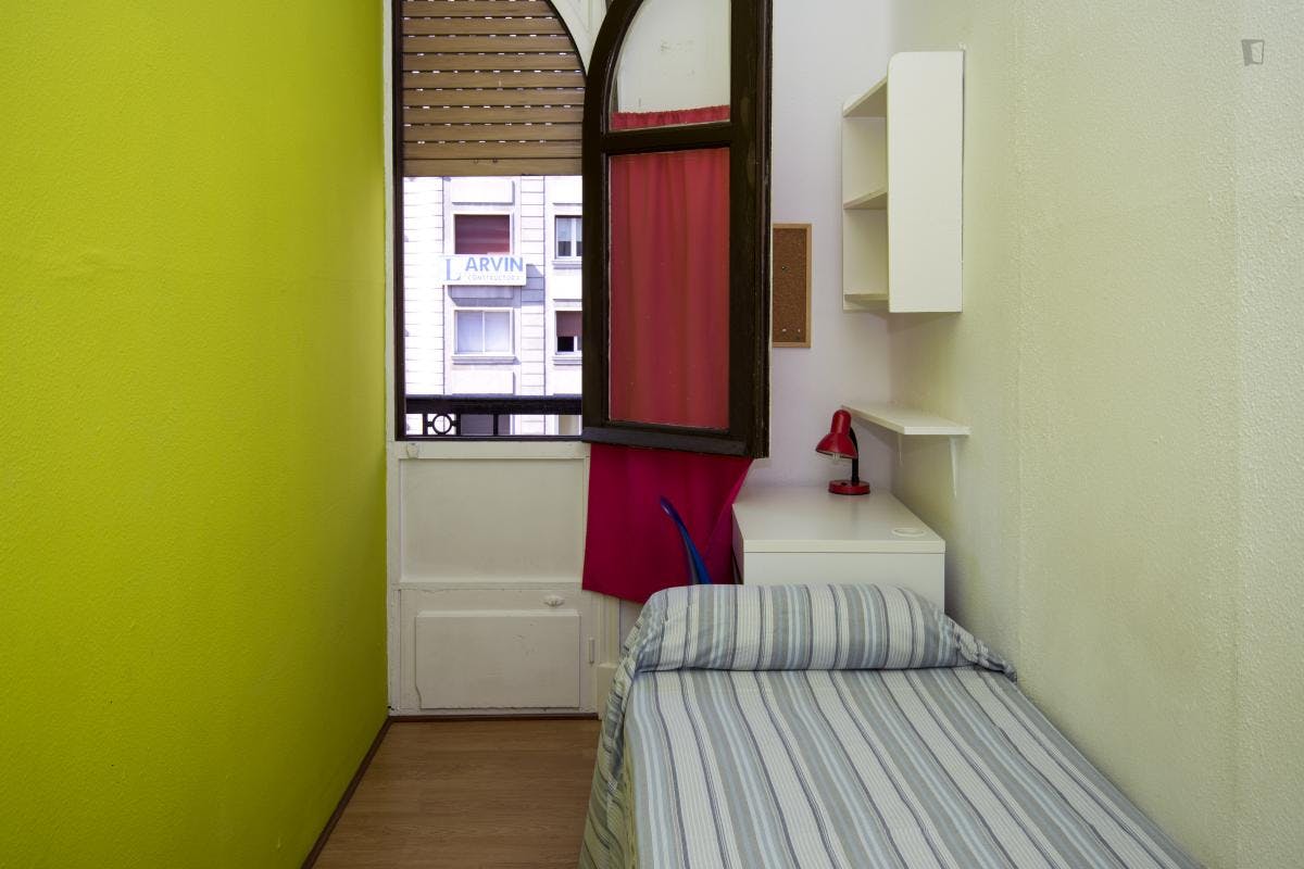 La habitación esta dentro de un piso compartido, en total viven 9 estudiantes, comparten la cocina, 3 cuartos de baño y los electrodomésticos. La calle Gran Vía está en el centro de Madrid, es una de las calles más conocidas y concurridas de toda la ciudad. Es una zona muy turística en la que se encuentran muchos lugares y edificios históricos y también muchos cines, teatros, cafeterías y restaurantes. El centro de Madrid es una de las zonas de compras más importante de la ciudad, con varias calles peatonales que facilitan el desplazamiento y permiten realizar las compras con toda comodidad. La Plaza España está a 100 metros y a 5 minutos caminando se encuentra el Teatro y el Palacio Real y los jardines que lo rodean. La Gran Vía es la arteria más importante del Madrid histórico, atravesando los lugares más conocidos de la capital: puerta de Alcalá, Plaza de Cibeles, Banco de España, Plaza de España, Plaza de Callao... En esta calle se encuentra la mayor parte de la oferta cultural de la ciudad: el Círculo de Bellas Artes, la sede del Instituto Cervantes, los teatros Lope de Vega y Coliseum y los cines Capitos y Callao, entre otros. Así mismo, abundan en esta zona todo tipo de comercios, desde tiendas de ropa y zapatos, perfumerías y supermecados, hasta restaurantes, bares y terrazas. A pocos minutos se encuentran tres de las zonas verdes más importantes de Madrid: el parque de El Retiro, el parque del Oeste – Templo de Debod y la Casa de Campo, lugares de esparcimiento donde pasear, practicar deporte y relajarse. También está cerca "Madrid rio" una antigua autovía reconvertida en un estupendo parque para pasear, correr, patinar, montar en bici etc....