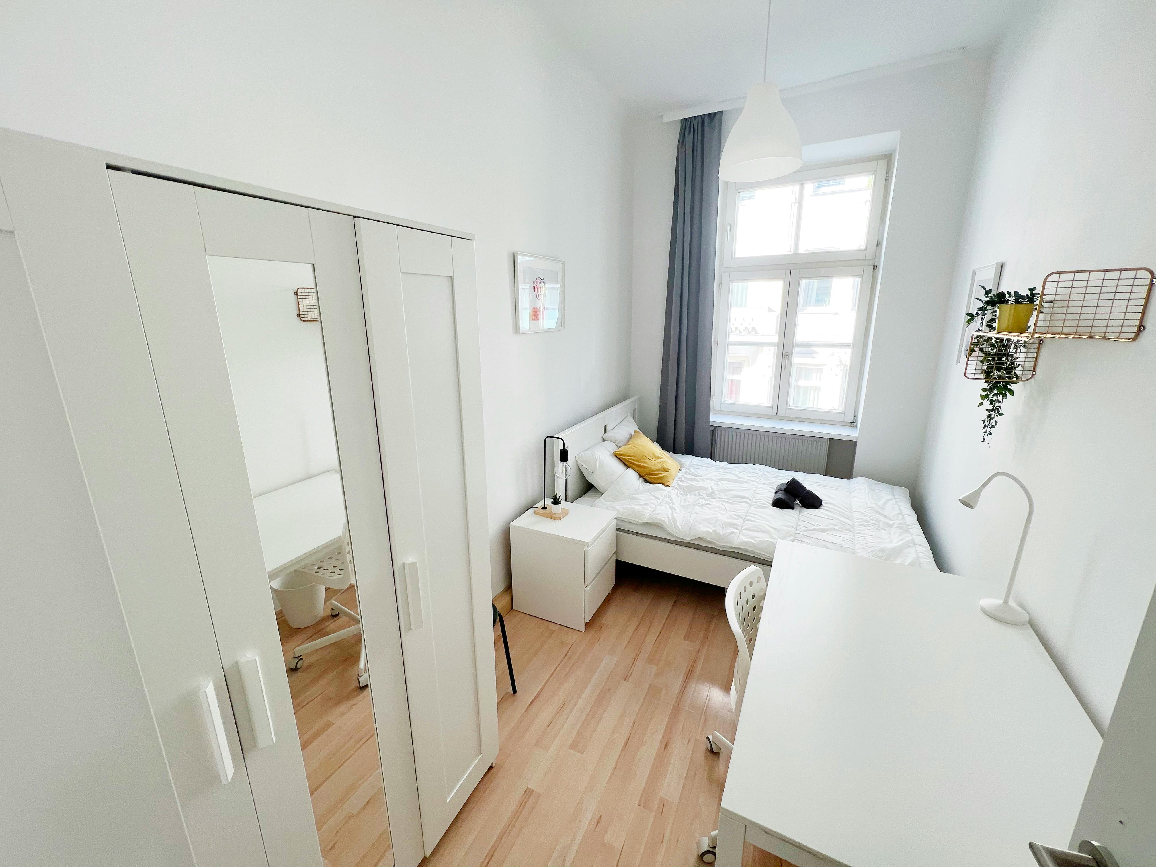 ROOM 1 on Floorplan If you want to live in Vienna and enjoy it's pulsing culture to the fullest, then this apartment is the place to be. Right next to the famous "U-Bahn Bögen" and in 200m walking distance to 2 Metro stops, this room will be perfect for everybody, that wants to live central and urban. It is located in one of the oldest parts of Vienna, where you can stroll around and discover the nicest sides and views of our capital. Whether you walk around Ringstraße and visit the most important buildings of Austria's heritage or you make a trip to the parks of Schloss Schönbrunn. The choice is your's. The apartment itself is located on the 2nd floor and has a kitchen with fridge, cooking utensils and crockery, a washing machine and wireless internet. Besides a shared living room, all private rooms are separately accessible, lockable and fully furnished. You have a double bed, a wardrobe, a bedside table, a desk, a chair, shelves and lamps. Connection to public transport: Within a very short walking distance (200m) you will find the Metro Stops Josefstädter Straße and Thaliastraße and also 3 Tram lines that take you everywhere in the city. You will reach: -The City Center (Rathaus) in 7 min -The Uni Wien in 9 min -The TU Wien in 12 min -The WU Wien in 20 min Further info: There is a bike storage on the property....