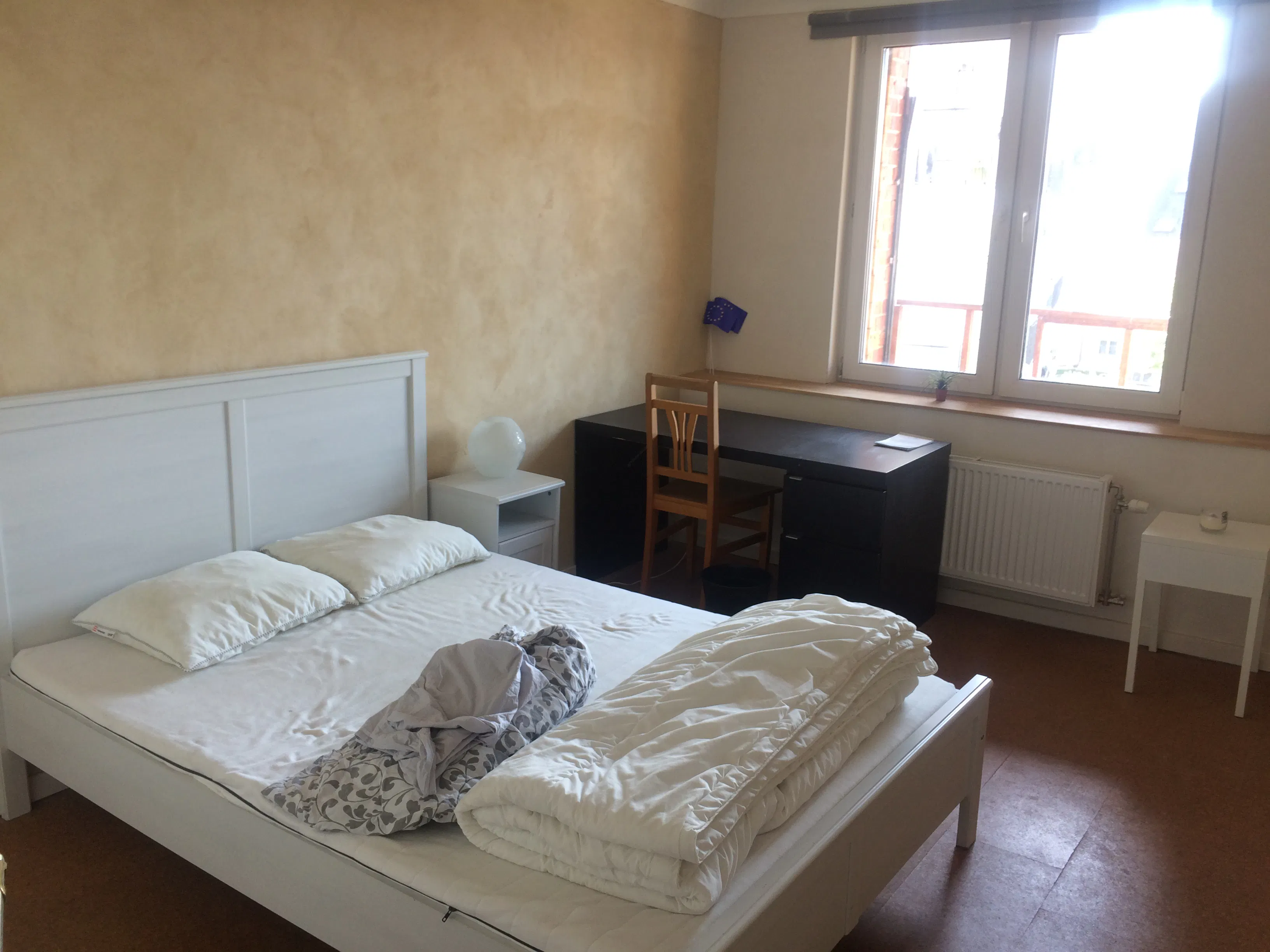Splendid ecological room in renovated house garden side (EU area) Nice room in an ecologically renovated triplex in the heart of Etterbeek (EU area: place Jourdan, Merode, Schuman) Within a group of 4 young international professionals (age 24-30) who like to share thoughts and experiences, one spot is available now. The house has been renovated (and elevated) over the last 6 years with superior quality and environment-friendly materials, it consists of 4 rooms, two bathrooms, kitchen, dining and living room and a splendid terrace with view on the 4th flooor. In this room, the floor is done in cork and the walls are cladded with lime (argile) which is a super regulator for the humidity and gives it a very comfortable feeling. If you step outside the window there is a little private terrace. The room shares its a bathroom with 1 other roommate. The rent per month with all costs included is set at 650 euros + 150 euro (charges for energy costs, wifi, cleaning common areas every 15 days). The flat is fully equipped: washing machine, dryer, internet, kitchen, dishwasher, tv... U can easily put your bike/step in the hallway downstairs. Address is Kolonel van gele 125, so near Merode, Schumann, La Chasse, Place Jourdan...