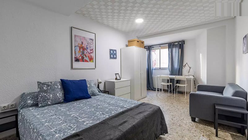 Spacious room with double bed for rent in Patraix The Spacious Spot Because you want more room in your room Will I like it here? Maybe. Are you searching for a simple but spacious spot to share in the city? Look no more. Check out 1 of these nice rooms. Really? Tell me more... You'll find lots to like about this practical apartment. Hang out in the well-equipped kitchen and get to know your new flatmates, or stick to your own nice bedroom— the rooms here are extra roomy. We think this is an ideal spot for anyone looking for all the essentials in a central spot. Your top 3 reasons to live here: Enjoy all your space— the rooms here are spacious. Cook up a storm in the well-equipped kitchen— it has all the basics. Catch a train across the city— you'll find 2 Metro stations nearby. Convenient. But you need to know this... You'll be sharing the bathroom with 4 more tenants. Help me make up my mind... This is a lovely 5th floor, 5-bedroom apartment on Carrer de Juan de Garay, Valencia. It's spacious. It's well-furnished. It's central. It has all the essentials for a happy stay. It is perfect for anyone looking for a pretty but practical place to share in central Valencia. Property type: apartment Floor: 5th Elevator: yes Number of bathrooms: 1 Wi-Fi installed: yes Transportation The apartment is less than a 7-minute walk from: -Metro Patraix -Metro Safranar **The rent is monthly, so regardless of the day you enter and leave, you pay full month. **El alquiler es mensual, por lo que independientemente del dia que se entre y se salga, se paga mes entero. 🕑 CHECK-IN TIMES: - Monday to Friday: 09:00h to 14:00h and 16:00h to 20:00h - Saturday: 09:00h to 14:00h - Sunday & Bank Holidays: Only opened the first Sunday of each month Please be aware that HousingAnywhere is an online booking platform. Therefore exchanging contact details and offering viewings is not possible. If you would like to reserve this accommodation, send me a booking request or a message and please mention your age and occupation. I look forward to meeting you...
