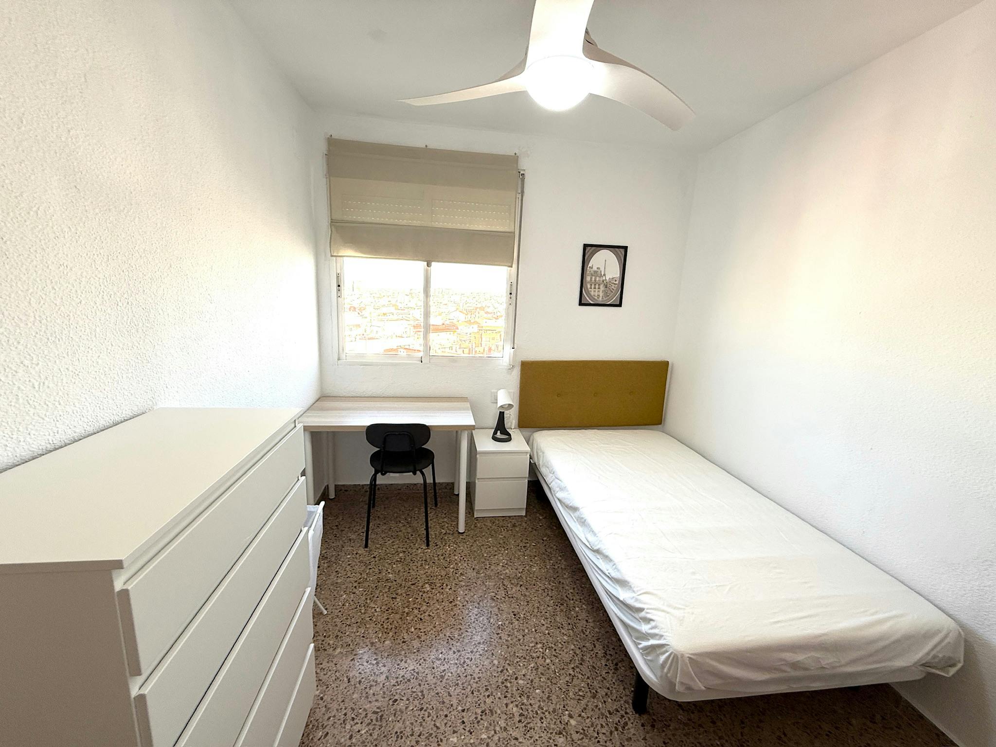ONLY FOR WOMEN Compact yet complete, offering a 105x190 bed, desk, ceiling fan, built-in wardrobe, dresser, and bedside table. Fortnightly cleaning of common areas included. Tailored for individual stays. 📜Please note that the bills are included up to 30€...