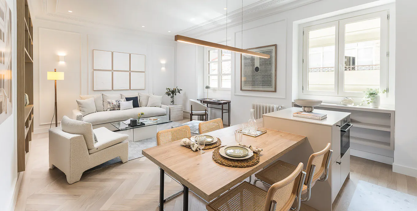 Promos by length of stay in the final price: -Booking + 4 months: 5% discount -Booking + 9 months: 7,5% discount -Booking + 12 months: 10% discount Please contact us to apply for the discount in your booking request! - Utilities included in the price up to 120€ - 180€ depending of the apartment. - Some apartments pets are allow by request. There is an extra charge for pets. Please contact us to know the supplement and availability! -- This elegant one-bedroom apartment, located in a stately building in the distinguished Justicia neighborhood, stands out for its refined interior design and high-quality finishes. The spacious and bright apartment has an open layout that maximizes space, enhanced by wooden floors that bring warmth and sophistication to every room. Its modern and carefully planned design creates a cozy and comfortable environment, ideal for those looking for a distinguished home in one of the most desirable areas of Madrid. Every detail has been selected to ensure maximum comfort, including central heating and ducted air conditioning to enjoy a perfect environment all year round. Located in the prestigious Justicia neighbourhood, on the emblematic Sagasta street, this exclusive apartment enjoys a privileged location, very close to the dynamic Trafalgar neighbourhood. Just a few steps from the vibrant Alonso Martínez area, the apartment is surrounded by an exceptional range of restaurants, cafés and designer boutiques. The area is renowned for its cosmopolitan atmosphere and active social life, as well as its proximity to other iconic neighbourhoods such as Chamberí and Malasaña. The excellent connection to public transport, thanks to the proximity of several metro stations, makes it easy to access any point in Madrid. This apartment combines luxury and modernity with a strategic location, providing an unrivalled living experience in the cultural heart of the capital...