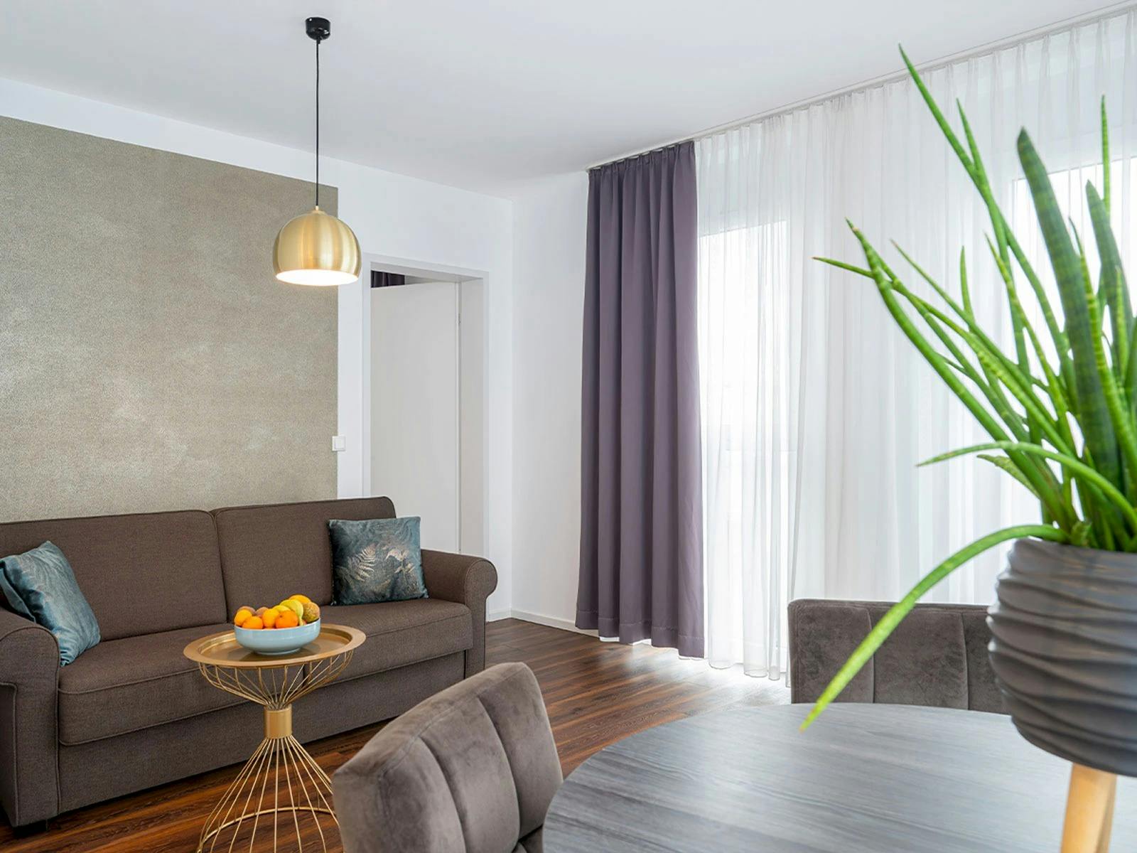 ✔️ Fully furnished corner penthouse apartment in Bad Homburg vor der Höhe ✔️ One of the two unique corner penthouses in the “(hidden),” featuring spacious dimensions and a private rooftop terrace ✔️ Modern equipment including a fully equipped kitchen, box spring bed, sofa with pull-out bed, and comfortable living and working areas ✔️ Floor heating, electric blinds, and barrier-free access for maximum comfort ✔️ Convenient washing options with WeWash App or coin-operated machines in the building 🛋️ The Apartment This spacious corner penthouse offers long-term business visitors a luxurious living experience, complete with a private rooftop terrace. The apartment features a hallway with wardrobe and full-length mirror, a living and working area, a separate bedroom, and a modern kitchen and dining area. The kitchen and dining area is fully equipped with a table and four upholstered chairs, a refrigerator with freezer compartment, a ceramic hob with two or four burners and an extractor hood, a dishwasher, a coffee machine, kettle, and toaster, as well as a microwave with baking function. All necessary kitchen utensils, dishes, and cooking equipment are provided for convenient everyday use. The living and working area includes a sofa with pull-out function, a sideboard with flat-screen TV. The bedroom features a 1.60 m wide box spring bed, two bedside tables with lamps, and a 2.00 m wide wardrobe complete with hangers. The bathroom is equipped with a shower, squeegee, WC, washbasin with storage cabinet, mirror, and hairdryer. Free WLAN access and a telephone connection are provided. 🏢 Building & Services The penthouse is located on the top floor of a modern, well-maintained residential building in Bad Homburg vor der Höhe. Tenants benefit from a digital laundry room with WeWash App for easy payment, as well as additional coin-operated washers and dryers on the ground floor. Floor heating, electric exterior blinds, private rooftop terrace, and step-free access ensure a high level of comfort. 📍 Location Situated in Ferdinandstraße, Bad Homburg vor der Höhe, the penthouse combines modern living with a peaceful environment. The area offers convenient access to local shops, cafés, and public transport while maintaining a quiet residential atmosphere...
