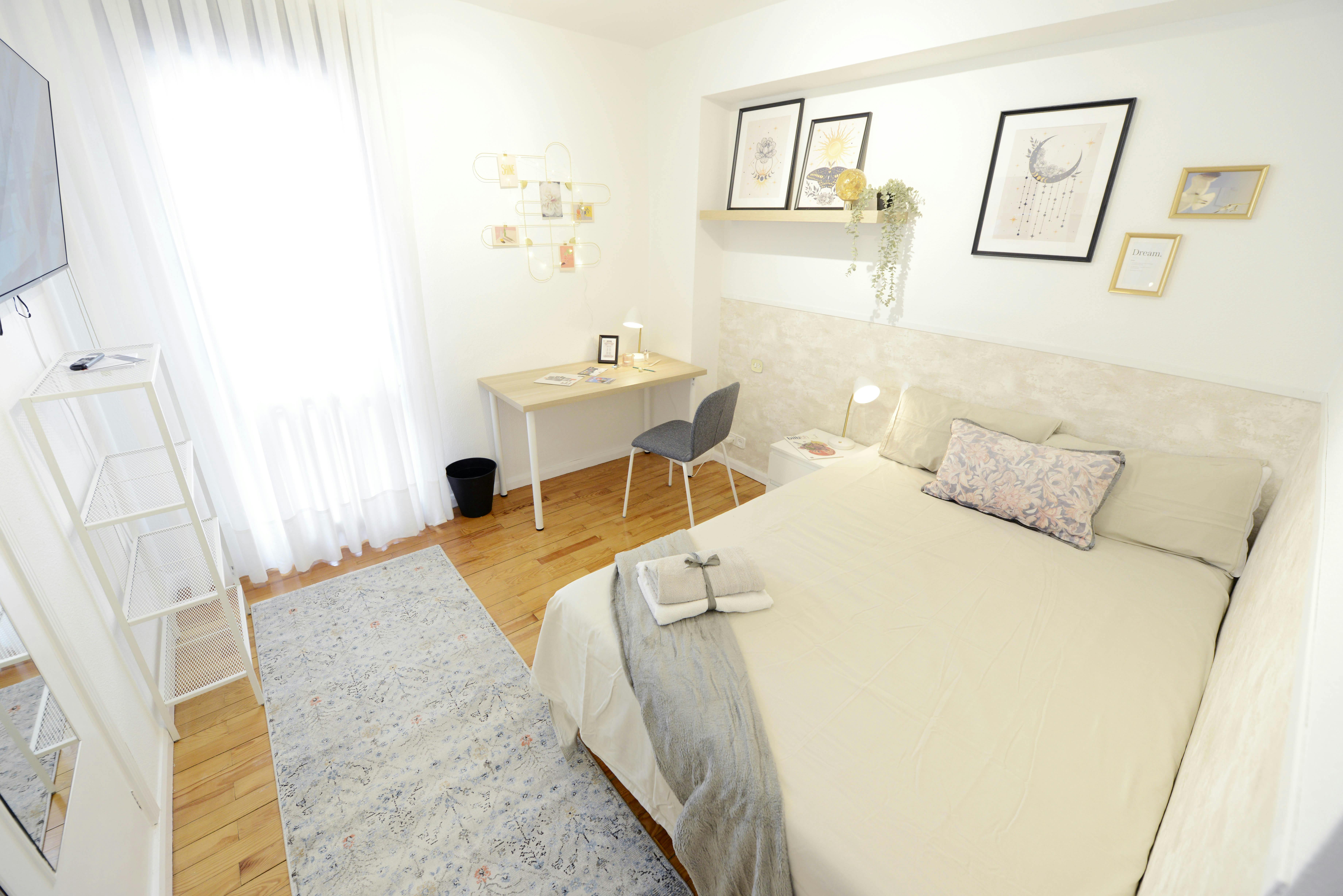 ZONA SOLOKOETXE HABITACIÓN H2 INDIVIDUAL Habitación de 14m2 Habitación con cama de 1,35x1,90m.. Suelo de madera y ventanas PVC. Calefacción y agua caliente central. Portero y recogida de basuras. Zona de estudio con mesa escritorio, silla y flexo. Equipada con un gran armario empotrado de 3 cuerpos, cama doble 1,35x1,90m. con detalles como cuadros, luces ... Ropa de cama: Protector de colchón, almohadas, plaid y cojines incluidos. Relleno nórdico, funda de relleno nórdico, toallas y sábanas no incluidas, se pueden comprar a la llegada. Alquilamos por meses naturales completos. Los gastos de suministros y limpieza de zonas comunes están incluidos en el precio. Por favor lee bien todos los detalles de los costes. CARACTERÍSTICAS – 110m2 | 4 habitaciones. – 2 habitaciones de uso individual o para pareja. – 2 habitación de uso individual. – Actualizado. ZONAS COMUNES – Cocina totalmente equipada con zona de comedor y zona de tendedero y plancha. – 2 baños completos con ducha . DESCRIPCIÓN DEL PISO Piso recién actualizado, cocina y 4 habitaciones amplias. Tiene 4 habitaciones, cocina-con zona de tendedero y electrodomésticos nuevos. Baños con duchas y mamparas. Suelo de madera, calefacción central y recogida de basuras. Es un piso cómodo y muy bien equipado con habitaciones amplias y armarios empotrados. Está situado en el No5 del Grupo Reverendo Vicente Garamendi (Grupo Garamendi),un grupo de viviendas altas, en una zona residencial con zonas verdes y muy bien comunicada. Muy cerca del Mercado de la Rivera y de la Plaza Unamuno. Entre Santutxu y Casco Viejo, en la zona de Solokoetxe. Se accede al Casco Viejo por varias calles. Los que buscan cercanía a zonas comerciales y turísticas tienen el Casco Viejo y Santutxu al pie de casa. El metro queda a 5 minutos (Plaza Unamuno o Santutxu salida Zabalbide) y se puede coger el Bus que te lleva a la Universidad de Leioa en el Ayuntamiento o en Santutxu. Hay varios trenes EUSKOTREN de cercanías con paradas en Casco Viejo (Zazpi Kaleak), Atxuri o Abando y líneas de autobuses BILBOBUS (pinchando en este enlace podrás ver las líneas con paradas más cercanas) y BIZKAIBUS, además del tranvía EUSKOTRAN para llegar a todo Bilbao y a sus alrededores que para en el teatro Arriaga o en Atxuri. Hay un super en la misma calle y todos los servicios muy cercanos (bancos, farmacias, centro de salud, mercado ...) en el Casco Viejo y Santutxu...