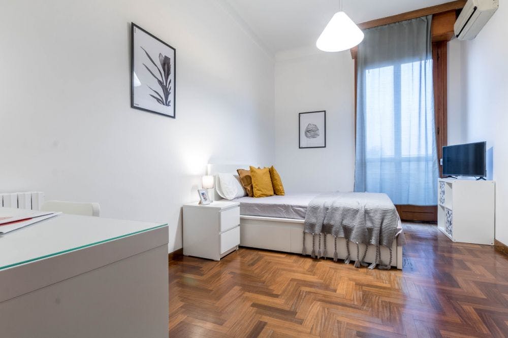 Charming flat in Milan, Viale Regina Margherita, in the heart of the historic center This large, elegant, and cozy flat is located in a strategic area of Milan, just steps from the historical center, the University of Milan, IED (European Institute of Design), and the Catholic University. The neighborhood offers everything you need, including supermarkets, restaurants, and numerous museums for art lovers. The flat is spacious and welcoming, situated on the third floor of an elegant building with elevator. It features an entrance hall, a fully equipped kitchen with two large refrigerators, two bathrooms with bath and shower, two single bedrooms, and two double bedrooms. Balconies throughout the flat fill the space with natural light, making it bright and pleasant. A few minutes from the main Milanese university campuses: - IED (Amatore Sciesa) 7 minutes walk; - UNIMI (Via Conservatorio) 12 minutes walk; - UNIMI (Via Festa del Perdono) 14 minutes walk; - Cattolica 20 minutes by tram number16; - Bocconi 20 minutes by tram number 9; - POLIMI 20 minutes by tram number19. The area is home to several supermarkets, shops and services for any need. Strategic location that allows you to enjoy the many activities that Milan has to offer. You will be able to explore the city not only by walk, but also thanks to a great public transportation network: - Tram lines (hidden) minutes walk from the house; - Metro red line San Babila, 15 minutes walking distance. Milan, Italy's fashion capital, is among the trendiest destinations in Europe for its historical heritage, culinary innovations and visionary designers. Its enchanting elegant palaces and tree-lined boulevards perfectly match with the greatest fashion boutiques. Milan is also home to countless restaurants and clubs that enliven the city all year round and also priceless historical monuments such as: Duomo, Castello Sforzesco, Quadrilatero della Moda, Galleria Vittorio Emanuele, Palazzo Reale and Cenacolo Vinciano. - Don't smoke - Pets are not allowed - Parties are forbidden - Take out the trash daily - Short-term visits are allowed Beautiful single room with views in Milan The single room is spacious and bright, featuring a small balcony with views of the Rotonda della Besana and Milan’s Duomo. It is furnished with a bed with storage drawers, a bedside table, a desk with a lamp, and a double-door wardrobe with internal drawers. Air conditioning is also included. An ideal solution for international university students and young professionals! ALL BILLS ARE INCLUDED up to 50 euro of expenses per month (if you will do a normal amount of usage, you would not have to pay for it!). After the payment of the first month rent on HousingAnywhere, to finalize the reservation, the tenant has to pay the deposit and the admin fee. The admin fee covers: -weekly cleaning service of the common areas for the entire duration of the contract; - contract registration fees (registration tax, stamps and registration fee); -maintenance. Contracts can’t end on 30 of April - 31 of May - 30 of June. Cancelling contract in advance is possible with three months notice period only after three months contract. If you cancel the contract before the natural ending you have to pay 200€ penalty...