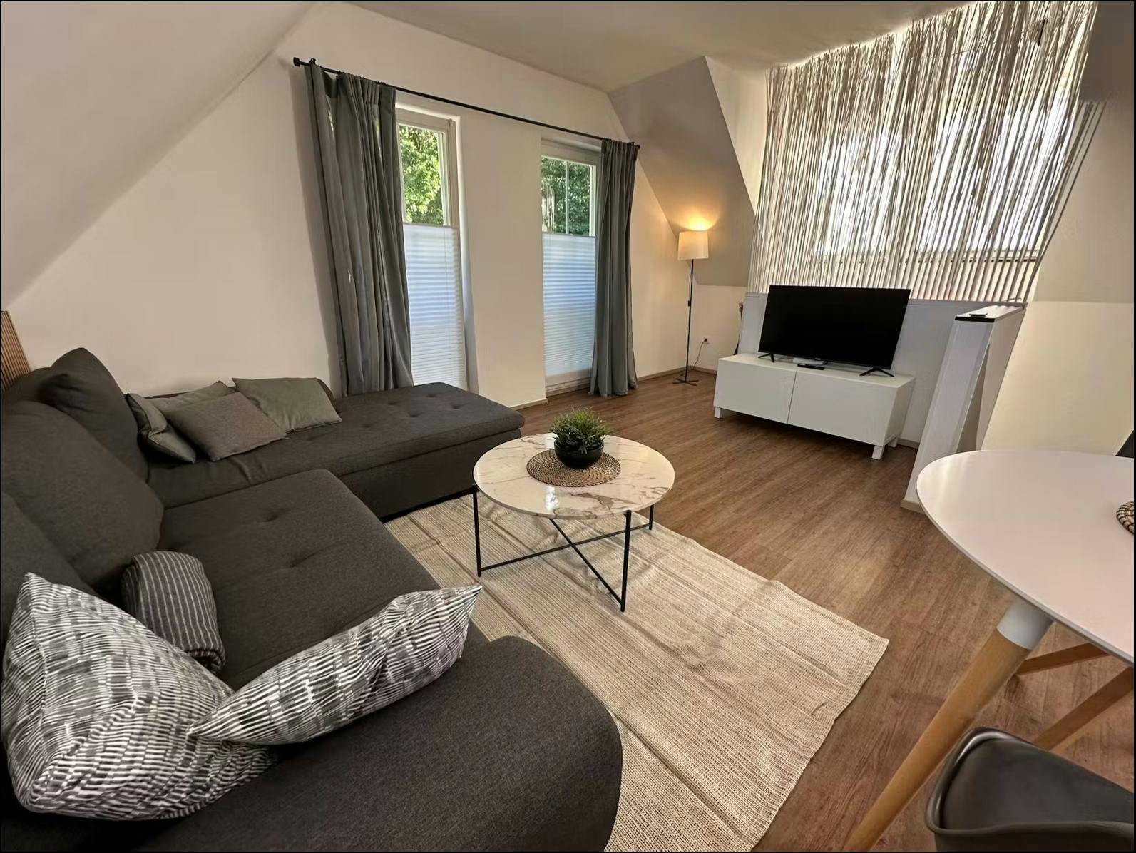 🏡 Spacious and Fully Furnished 2 Rooms Apartment in the green area of Hamburg-Öjendorf• Completely Renovated and Newly Furnished as of May 2025 🌟 Apartment Details: A stylish separated bedroom, 1 separated living room/kitchen and 1 bathroom. 👍🏻The apartment is fully furnished and equipped: 🟢The kitchen has an induction stove, fridge, microwave, oven, dishwasher, washing machine, coffee machine, toaster, kettle, blender and all the essentials for the kitchen (plates, bowls, utensils, mugs, glasses, wine glasses, cookware, kitchen towels...) 🟢The living room has a comfortable sofa bed, a dining table with 2 chairs, a coffee table and a smart TV. 🟢The bedroom has a double bed king size (1.80x2.0m). A two large wardrobes, . . . The bed linens, blankets, pillows, and towels are provided. 🏠The apartment is located in the 1th floor, has a central heating, laminate floor and a free high speed Wi-Fi included. Large windows giving access to a lot of day light/sun. 2 chairs and a table outside. An iron, iron board, a clothing rack and a vacuum are provided as well. 📍Located in the heart of Öjendorf, a green and quiet residential area with a park and a lake. A big supermarket is just a couple minutes walk away and many other shopping options. 🌟 Inclusive in rent are the following: Heating, Water, Electricity and Internet. The government broadcasting fee for TV Channels is to be paid by the tenant....