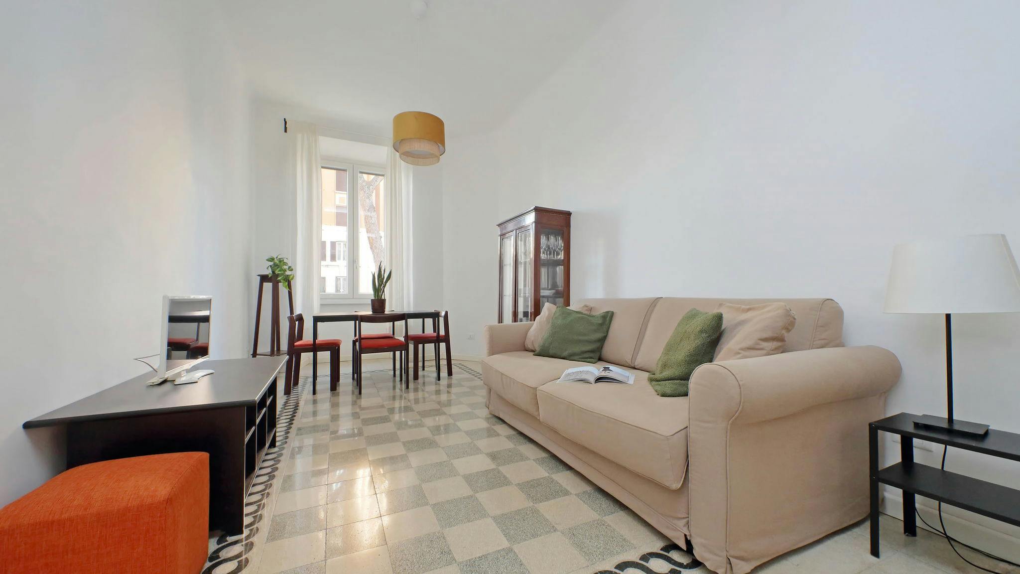 The Taranto 95 apartment is a modern 60 square meter apartment located on the first floor of a building equipped with an elevator. The well-distributed surface ensures comfort and functionality, making it particularly suitable for couples or small families who want to explore Rome with all the necessary amenities. The apartment consists of a bedroom with a double bed, a cozy living room with a double sofa bed that can accommodate up to four people, and a fully equipped kitchen with oven, refrigerator with freezer and kettle for preparing meals and drinks. The bathroom completes the structure, creating a functional and well-organized environment where every space is optimized to ensure maximum comfort. The apartment has all the essential services for a comfortable stay: fast Wi-Fi to always stay connected, washing machine to take care of the wardrobe during the stay and heating to ensure maximum comfort in every season. The television in the living area offers moments of relaxation after days spent in the city, while the non-smoking environment ensures a fresh and healthy atmosphere. RENTAL CONDITION: Rent includes all utilities based on normal use; if you exceed with the usage of gas and electricity, the extras will be deducted from your deposit. Details will be specified in the rental agreement; Internet, wi-fi, water, building expenses and contract registration costs are included in the rental price; Early termination of the contract: after the minimum required stay of one month, you can terminate the contract earlier and without penalties by informing us 21 days before your expected move-out date; We apply a daily contract on 30 days: we calculate the rent in proportion to the number of days of your stay: e.g. December is calculated on 31 days, February on 28 etc etc...; RENTAL AGREEMENT: As per Italian Law, it is mandatory to apply for a valid Italian Tax Code in order to sign the rental agreement. You can apply for one by contacting your local Consulate, or by going to the Agenzia delle Entrate no later than one-week prior check-in. If you can't get one on time a charge will be applied. The rental agreement must be signed prior check-in. Failure to do so will result in the impossibility to enter the apartment. PAYMENTS: In order to complete the booking the following payments must be completed, at least 2 weeks before the check-in date: - the deposit, that we will give you back at the end of your stay within 30 business days after the check-out date; - one-time initial and final cleaning fee (starting from €175) depending on the size of the flat. - for all apartments located in Rome, the cost of the city tax is required at check-in. This is equal to €3,50 per person per night...
