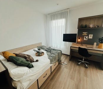 🏡 Modern Student Residence in Girona! This exterior-facing room, situated on the fifth and sixth floors, includes a 135 x 200 cm bed, a dedicated study area with a desk and chair, a smart TV that can function as a work monitor, high-speed Wi-Fi access throughout the room and common areas, a private full bathroom, and a private kitchen containing an oven-microwave, induction cooktop, sink, and refrigerator. 🍳 About the residence: This residence is designed with students in mind, providing a variety of shared amenities to enhance your experience. Enjoy access to coworking spaces for studying, a gym to stay active, a cinema room for movie nights, and social lounges to connect with other residents. Laundry facilities, secure parking, and 24/7 security ensure your daily needs are covered. 📍 About the area: Located near the University of Girona’s main campuses, this residence is surrounded by Girona’s natural beauty and cultural landmarks. You'll have easy access to academic buildings, public transport, and the vibrant city center. Nearby, you’ll find restaurants, cafes, shops, and plenty of green spaces for relaxation. Ready to start your new adventure in Girona? This residence is more than a place to live—it’s a community where you’ll create unforgettable memories! HousingAnywhere is an online booking platform. Therefore, exchanging contact details and offering viewings is not possible before the booking. We look forward to meeting you...