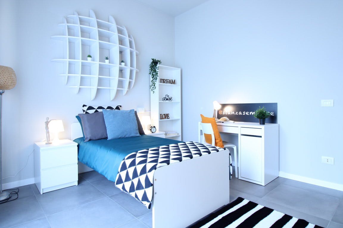 Zona ospedale, posizione strategica e ambita, si affitta una ampia camera singola con balcone ristrutturata appositamente per offrire comfort e comodità ai nostri studenti. La è dotata di letto singolo, armadio 3 ante, scrivania con portaoggetti, comodino, tendaggi, specchio, scarpiera, libreria. I colori delle pareti favoriscono il buon umore e aiutano nello studio...