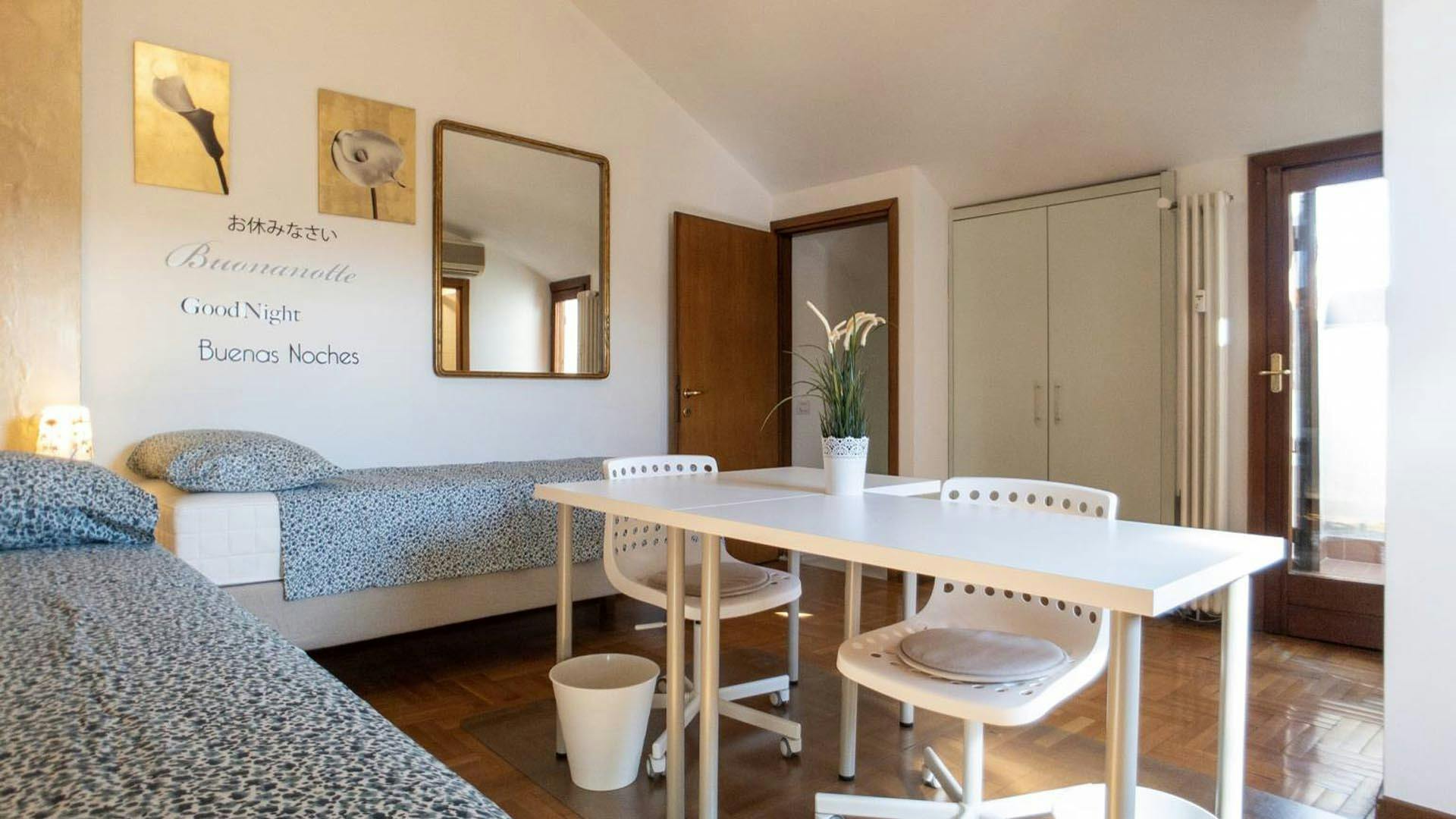 The apartment in Via Degli Scipioni 6 is a multi-room apartment shared by university students, interns or young workers. On the 6th floor there are the kitchen with the living room, 4 private bedrooms and 1 bathroom. On the upper floor there is a shared room with two small terraces and 1 private bathroom. The apartment is approximately 180 square meters and is located on the 6th floor of a residential building. The apartment in Via Degli Scipioni 6 has a strategic position to reach the city center of Milan. Close to the apartment there are the bus stations of the lines 5, 19, 33 56. In a few minutes by walking it is possible to reach the metro station Piola of the M2 Green line and the Lima station of the M1 Red line. This solution is therefore ideal for university students of the Politecnico di Milano and Università degli Studi of Milan. The area is served by all services: supermarkets, shops, bars, restaurants and take-aways. In an apartment located in via Degli Scipioni 6, this shared room is reserved for university students, interns or young workers. Fully furnished, it is equipped with two single beds, each one with bedside table and lamp, two wardrobes, two bookcases, two desks and chairs. Kitchen, living room and bathrooms are shared with the other tenants of the apartment. Includes utilities: building expenses, heating, water, electricity, internet, garbage tax, periodical cleaning services of common areas; utilities adjustments excluded. RENTAL CONDITIONS: -BI-WEEKLY CONTRACT: If you move in during the 2nd half of the month, you will only pay half-a-month’s rent for that month. If you move out during the 1st half of the month, you will only pay half-a-month’s rent for that month. I always rent from the first day the room is available. - ALL - INCLUSIVE Monthly rent: water, gas, electricity, wi-fi, condominium fee all included! - DEPOSIT that it will be given back to you at the end of your stay. - CONTRACT REGISTRATION (one time fee): depending on the room you are interested in. Please check the field OTHER to see this fee. - ONE TIME ADMIN FEE: We are a professional property management company and for this reason we also include initial and final cleaning of the room; cleaning of common area of the flat every two weeks; 2 bed-linen; contract activation and termination: professional assistance service and property maintenance during your stay: we will take care of everything! Do you want to finish your contract earlier than agreed? Don’t worry, please inform us and if you find a substitute (of course we can also help you!), you can leave without any type of penalties. Please be aware that HousingAnywhere is an online booking platform. Therefore exchanging contact details and offering viewings is not possible. If you would like to reserve this accommodation, send me a booking request or a message and please mention your age and occupation....