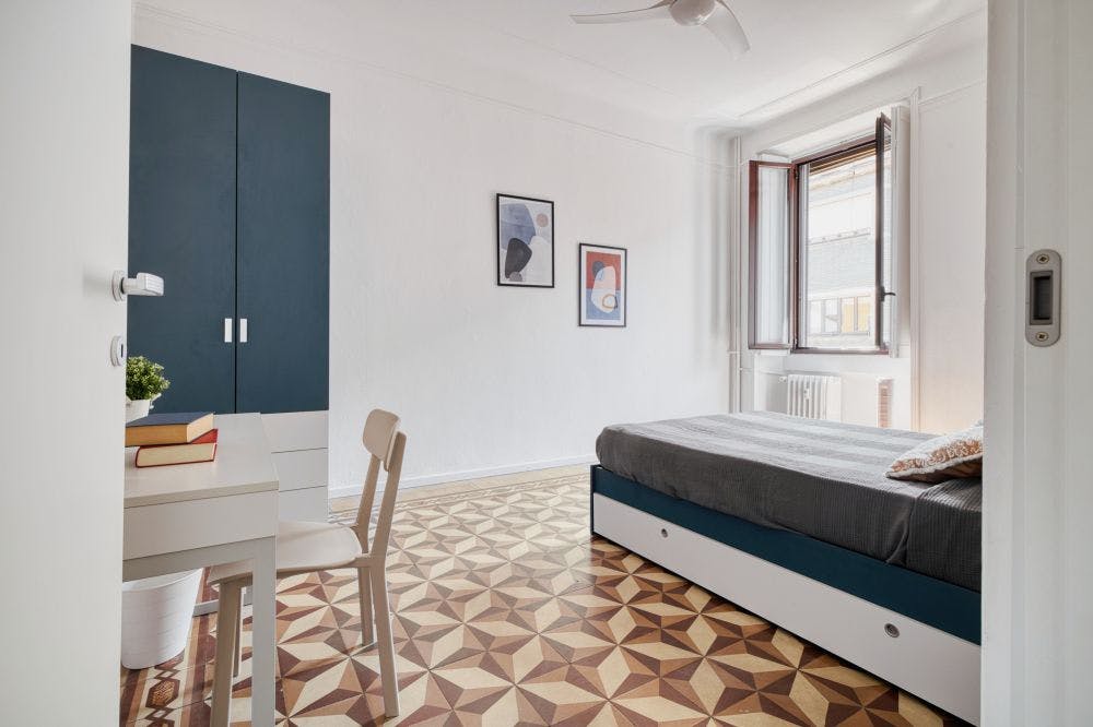 Wonderful flat in Milan, via Brioschi - Bocconi The flat is located in a convenient and strategic area, especially for university students. From here you can quickly reach Bocconi University, the IULM, the New Academy of Fine Arts (NABA) and the Navigli. The area is equipped with everything you need from supermarkets and other commercial activities. This wonderful flat is composed of a well equipped open kitchen with balcony, two wonderful single bedroom and bathroom with balcony, shower and washing machine. The flat is located in the heart of the southern Milan university area: - IED (Pompeo Leoni) 12 minutes walk; - BOCCONI 13 minutes walk; - NABA 13 minutes walk; - CATHOLICA 20 minutes (Tram Line 3) The area counts with several supermarkets, shops and services for any need. You can find the Esselunga supermarket at only 3 minutes far. Strategic location that allows you to enjoy the many activities that Milan has to offer. You can easily explore the city by walk or thanks to a great public transport network: - Tram number 15, Duomo (7 stops); - Tram number 3, Piazza Ventiquattro Maggio Colonne di San Lorenzo (5 stops); - Metro Green Line Abbiategrasso (tram 15 for 3 stops). Milan is the Italian fashion capital and recently became one of the trendiest destinations in Europe for young internationals. It boasts a priceless historical heritage, gastronomic culture and visionary designers. You will be amazed by big, elegant palaces, tree-lined boulevards and cutting-edge boutiques all around Milan. Moreover, it has plenty of restaurants and clubs that liven up the city all year round, but also famous historical sights such as: Duomo, Castello Sforzesco, Quadrilatero della Moda, Galleria Vittorio Emanuele, Palazzo Reale and Cenacolo Vinciano. - Don't smoke - Pets are not allowed - Parties are forbidden - Take out the trash daily - Short-term visits are allowed Wonderful single room in Milan, few steps away from a Bocconi, IULM and NABA Wonderful single room in Milan, equipped with a large window that makes it very bright. The room has a double bed with drawer, a bedside table and a desk with lamp. It also include a big double wardrobe with drawers. It is the ideal solution for international students and young workers! ALL BILLS ARE INCLUDED up to 50 euro of expenses per month (if you will do a normal amount of usage, you would not have to pay for it!). After the payment of the first month rent on HousingAnywhere, to finalize the reservation, the tenant has to pay the deposit and the admin fee. The admin fee covers: -weekly cleaning service of the common areas for the entire duration of the contract; - contract registration fees (registration tax, stamps and registration fee); -maintenance. Contracts can’t end on 30 of April - 31 of May - 30 of June. Cancelling contract in advance is possible with three months notice period only after three months contract. If you cancel the contract before the natural ending you have to pay 200€ penalty...
